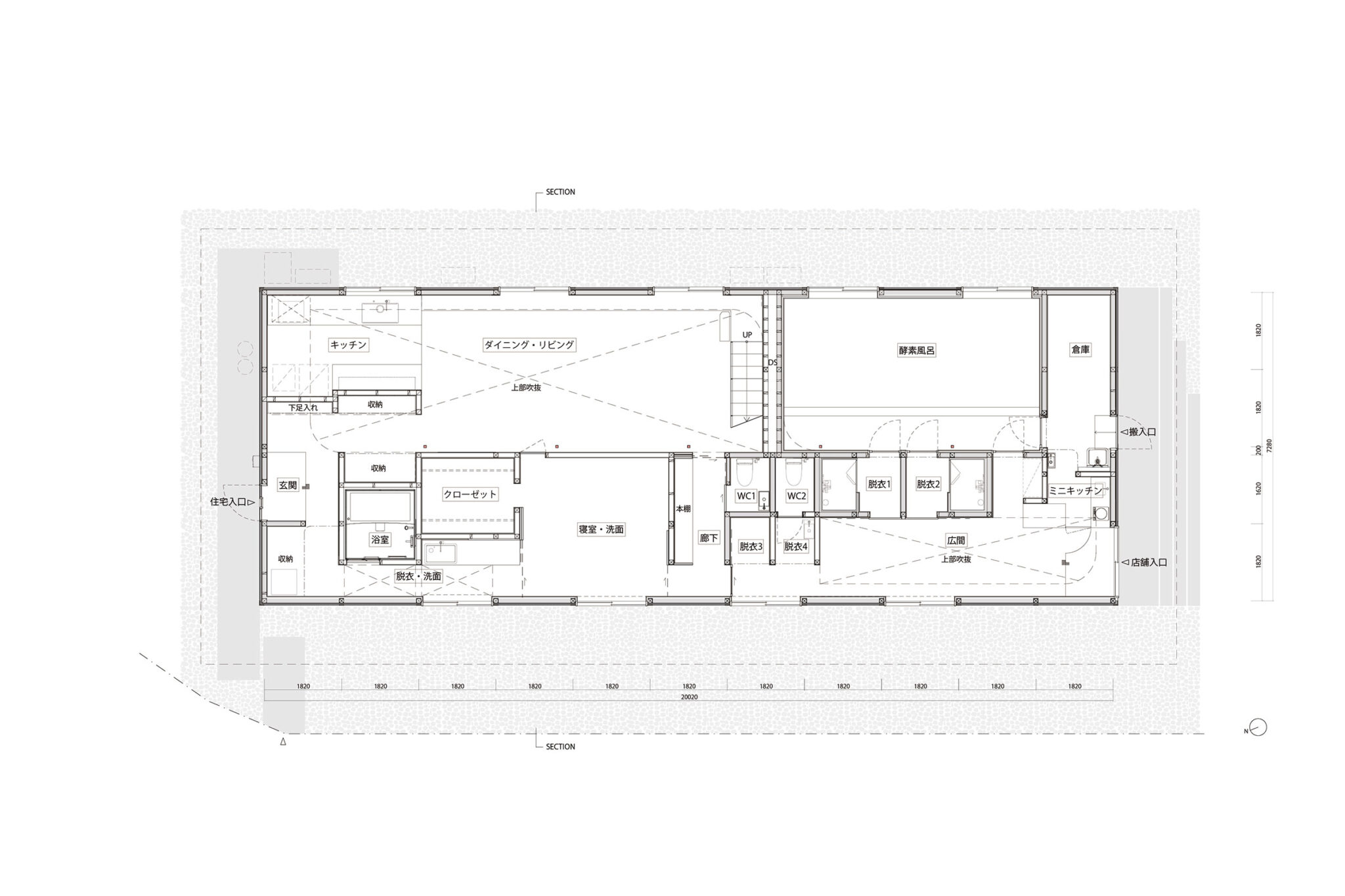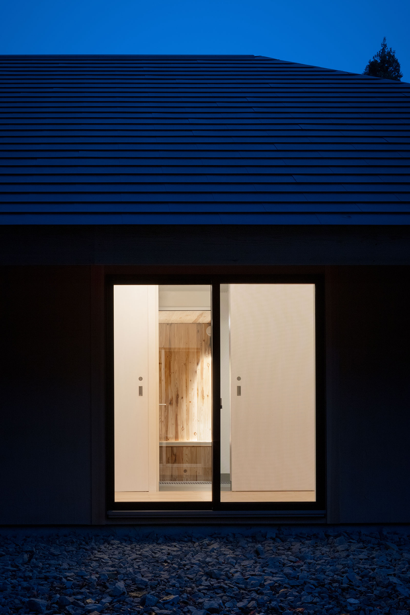 青柳創と青柳綾夏による、岩手の「金ケ崎の家」。寄棟屋根や左官真壁の採用が必須な地域。意思と無関係に“外形が決まる”状況に対し、通常と異なり“内部の空洞”の支え方を思考せざる負えない設計過程に着目。空洞を実態に変質させるべく極細列柱の構造体を考案1階、店舗部分、酵素風呂 photo©太田拓実