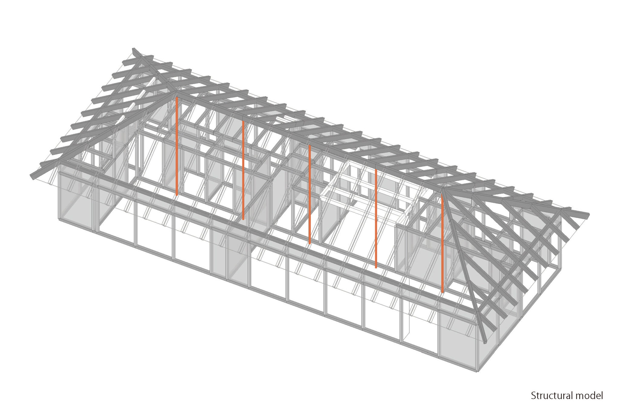 まず、垂木・母屋・束を省略し、水平距離3640mmある棟木と軒桁の間に105×210の登梁を架け渡した。大きな屋根荷重を支える105×270の棟木は、5本の鉄骨柱で支持されている。鉄骨柱の断面は□-60x60x4.5、全長は約4600mm、細長比は200を超えている。細柱は桁の高さで木造部分に腕を出し座屈を拘束している。小屋組の存在感は極細の鉄骨柱に集約された。