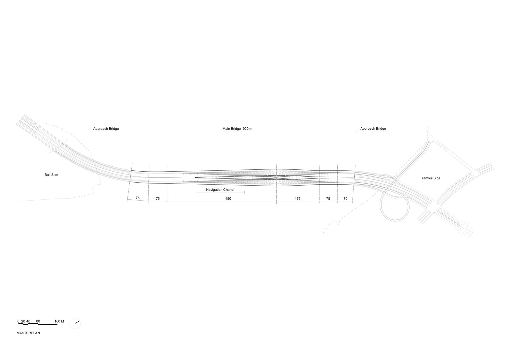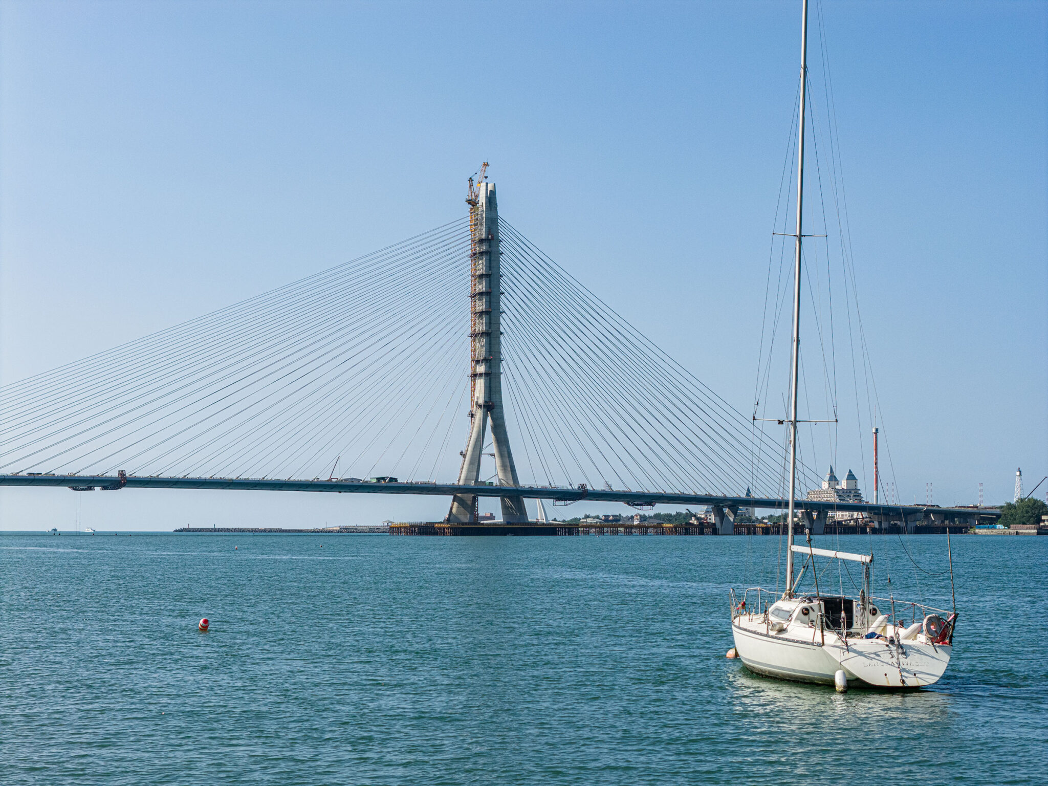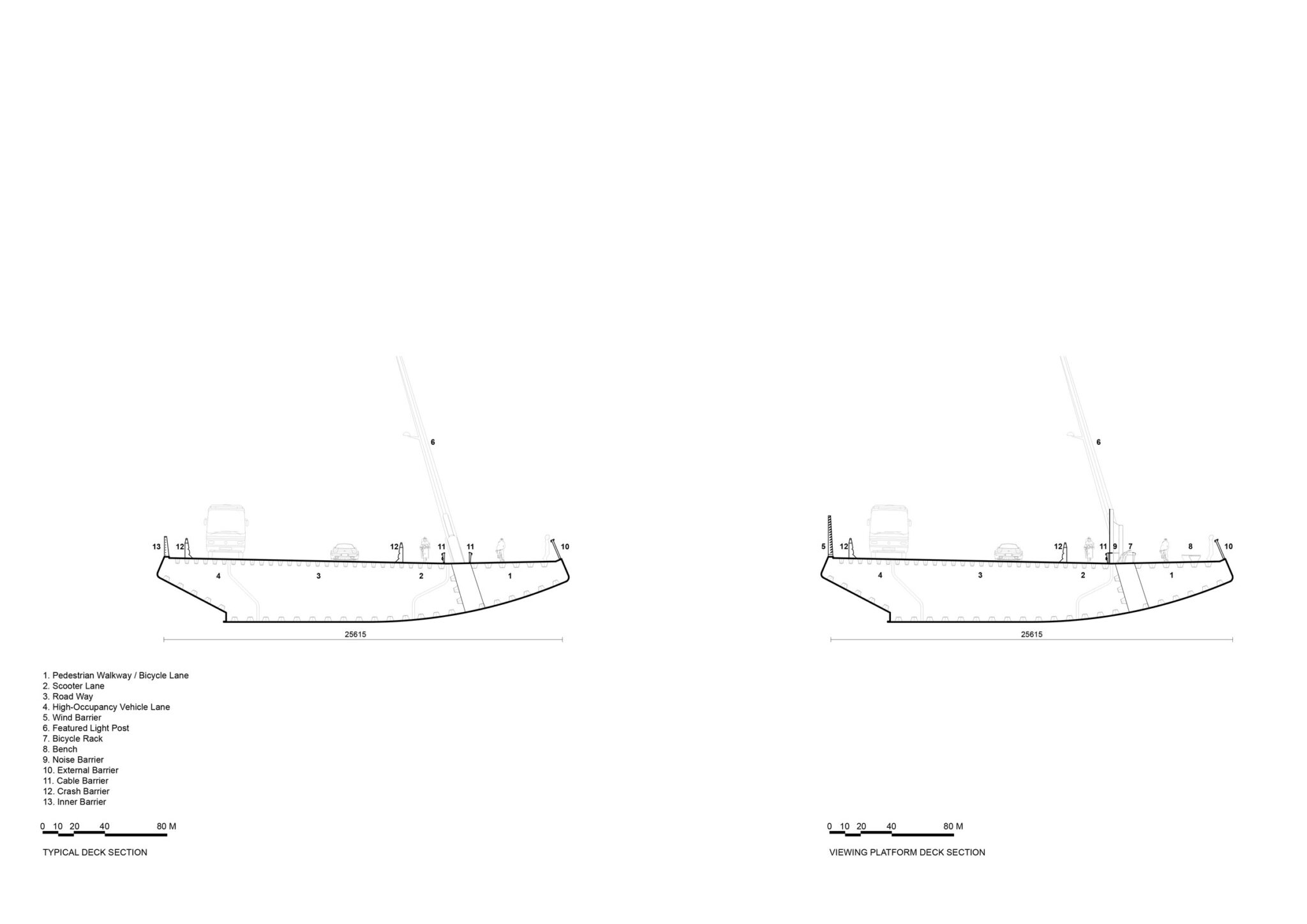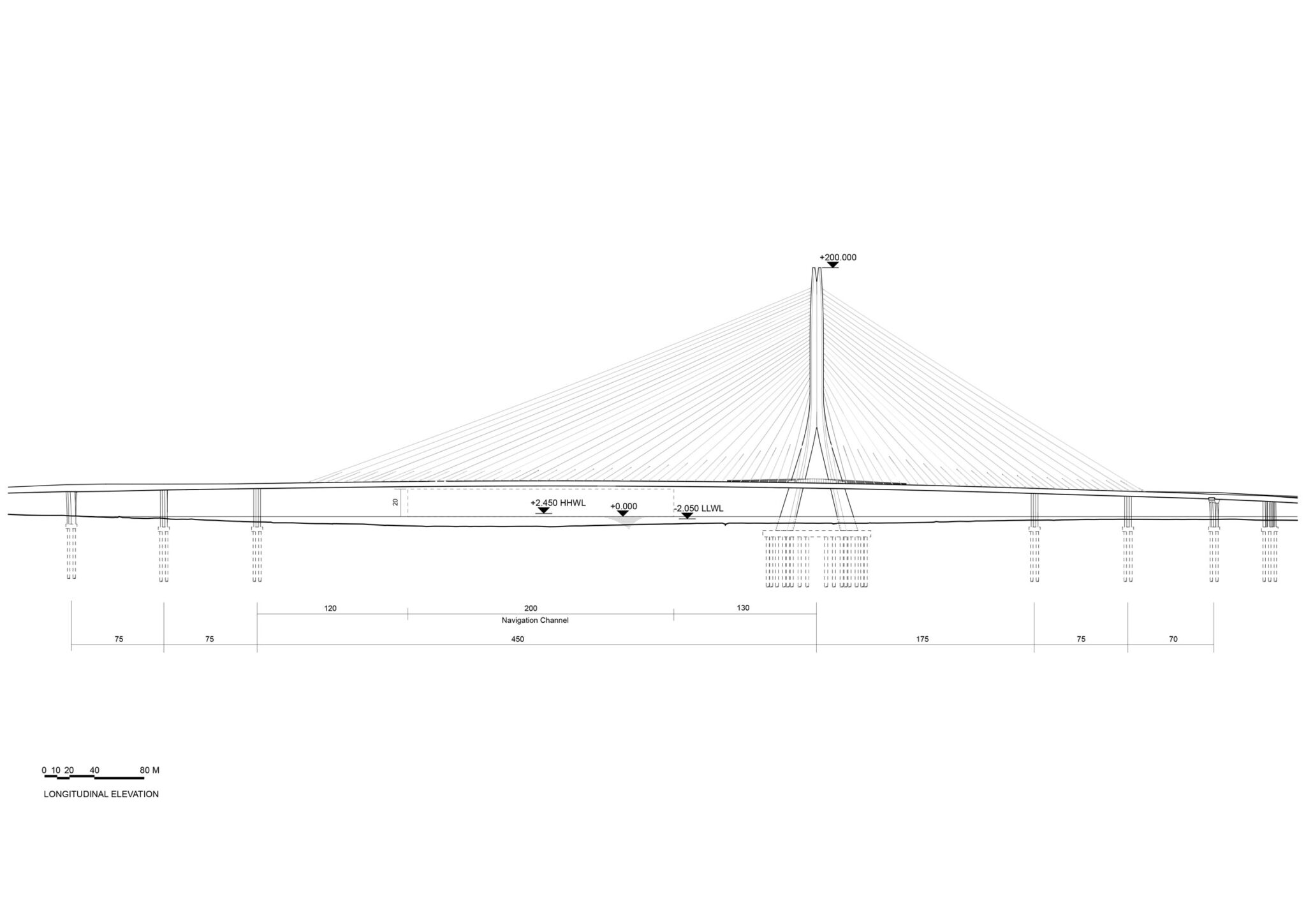 河口の詳細な3Dモデリングとマッピングによって定められた、橋の彫刻的なマストの川内での位置と、橋桁の水面からの高さは、河川航行船舶の安全な通行を確保し、川沿いの人気の展望地点からの夕日の眺望を妨げないように計算されています。