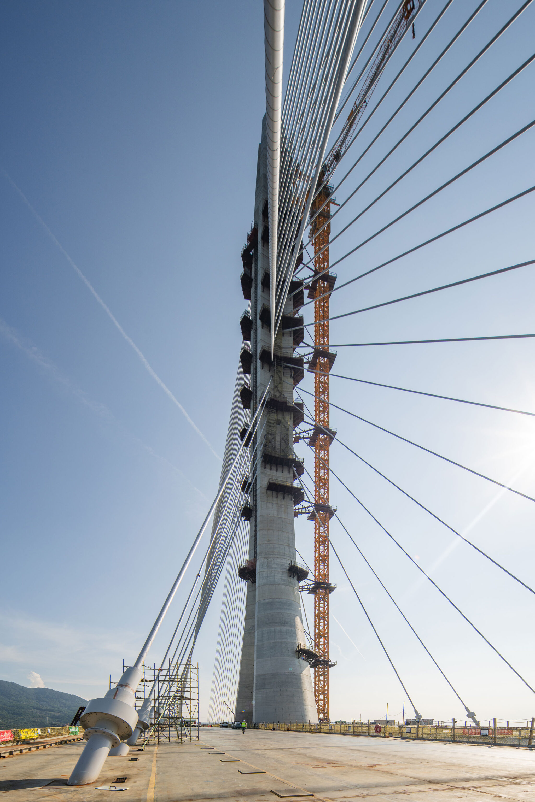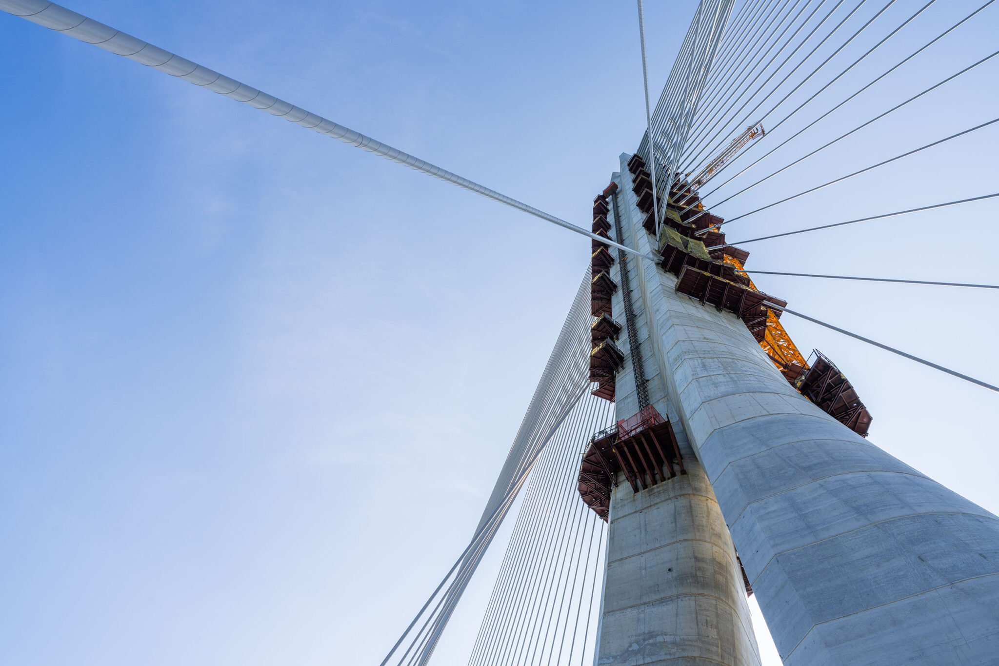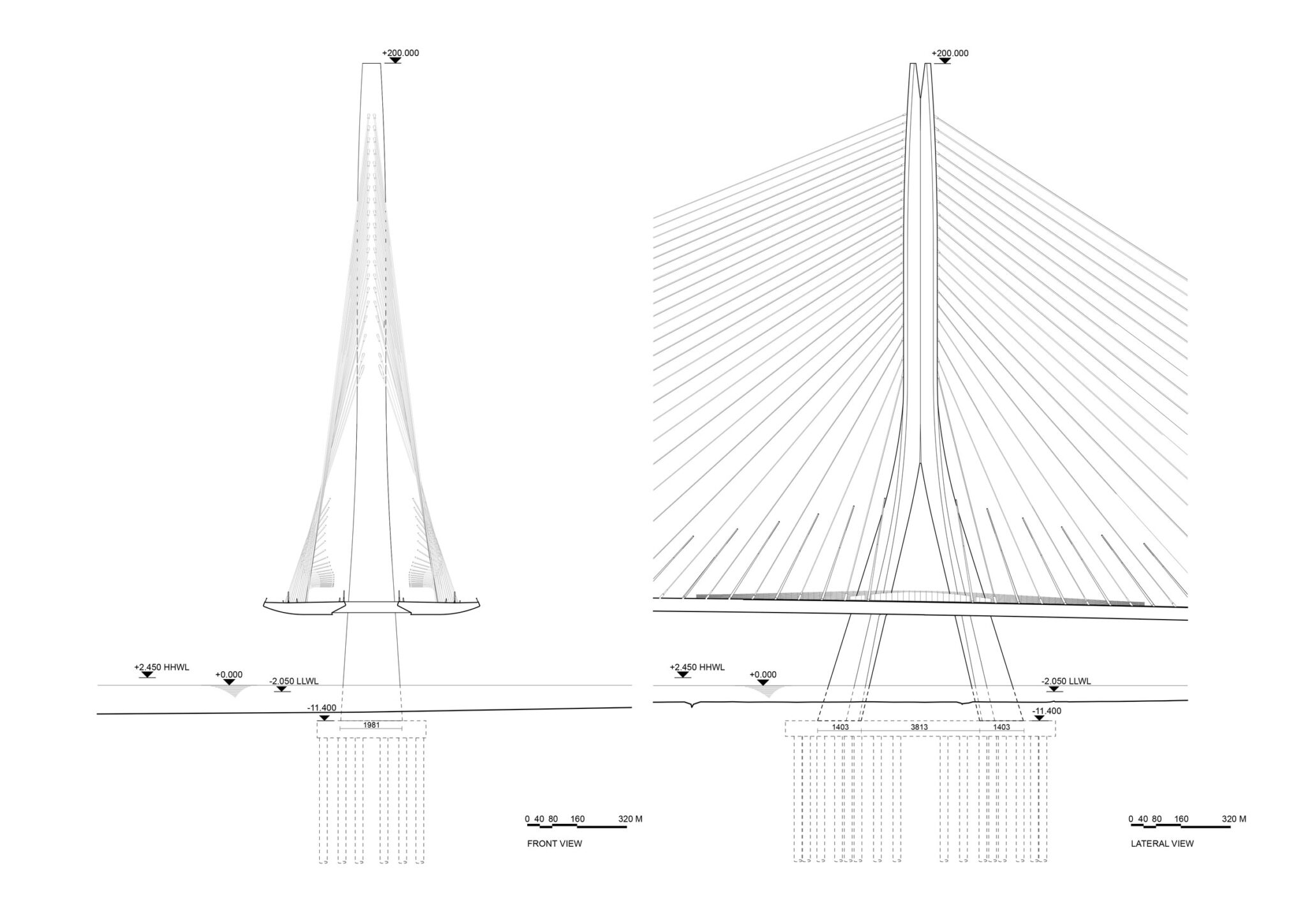 夕日の眺望を損なわずに構造性能を最適化するように設計された彫刻的な高さ200メートルのコンクリート製マストは、過酷な気象条件や地震時にも橋の中央スパン450メートルを安全に支えられるよう、可能な限り細く設計されています。