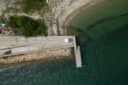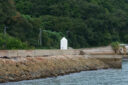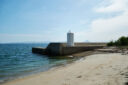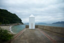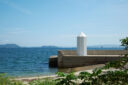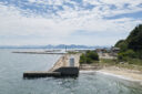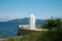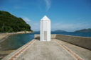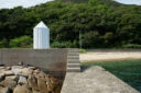 大室佑介アトリエによる、香川・多度津町の「鳥のための塔」。アート祭への出展作品として計画。“雄大な自然への敬意”と“墓地に近接する立地”も考慮し、島の一部となる“ささやかな塔”を志向。正八角形の柱の中に“円筒状”の内部空間を作って中谷ミチコのレリーフを配置外観、海側より見る。 photo©若林勇人