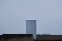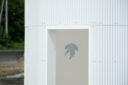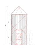 会場の中心となる浦集落から少し離れた防波堤沿いに建つ「鳥のための塔」は、設計者自身と数人の協力者の手によって現地で組み立てられた。塔の外形は、幅1,820mm軒高3,640mmの1:2の比例に基づいた正八角柱の上に、矩勾配の角錐屋根が載る単純な幾何学形によって構成され、外皮を縦方向の線が強調される波板で覆うことにより、垂直方向へのシルエットを強調している。