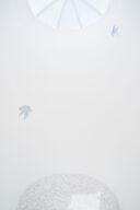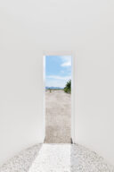 湾曲した壁面には彫刻家・中谷ミチコによる凹型のレリーフ作品「青い鳥」が二羽埋め込まれており、その表面に充填された透明樹脂の反射も相まって、静謐な内部空間に微かな揺らぎを与え、水平に広がる瀬戸内海の景色から遮断された垂直の展示空間は、作品と一対一で向き合い、自然の奏でる音や光を享受するための装置となっている。