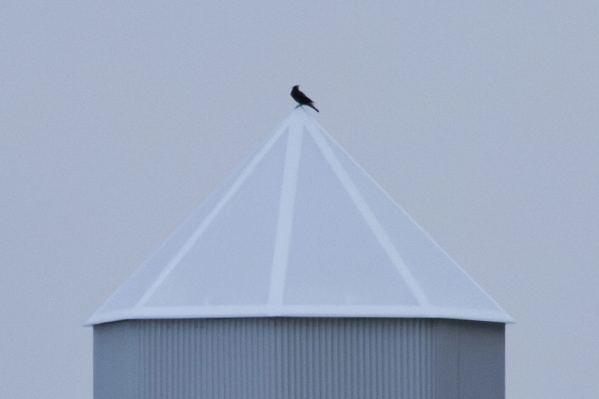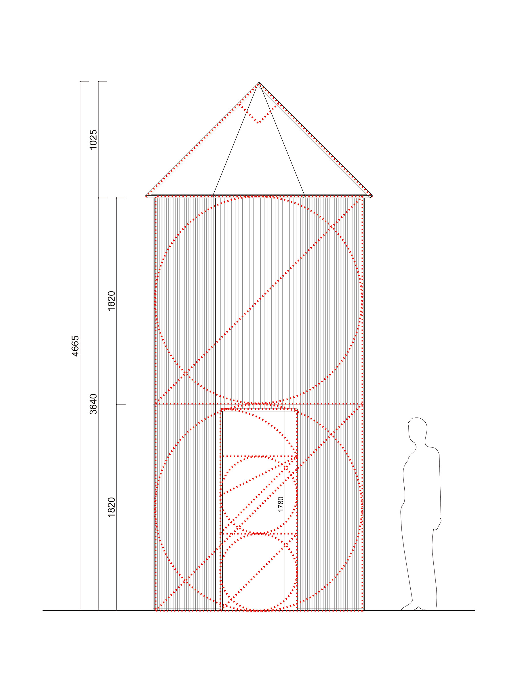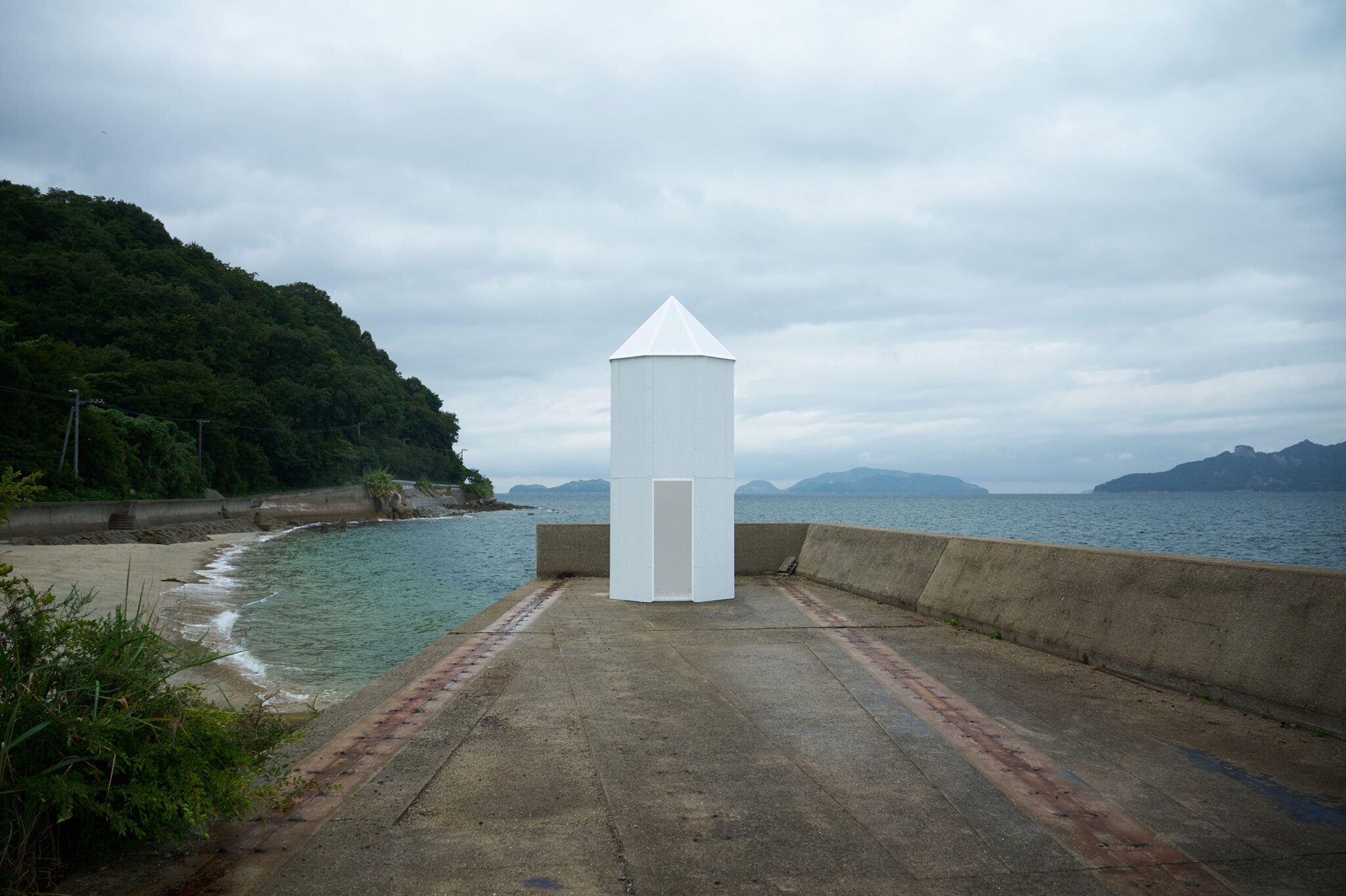 会場の中心となる浦集落から少し離れた防波堤沿いに建つ「鳥のための塔」は、設計者自身と数人の協力者の手によって現地で組み立てられた。塔の外形は、幅1,820mm軒高3,640mmの1:2の比例に基づいた正八角柱の上に、矩勾配の角錐屋根が載る単純な幾何学形によって構成され、外皮を縦方向の線が強調される波板で覆うことにより、垂直方向へのシルエットを強調している。