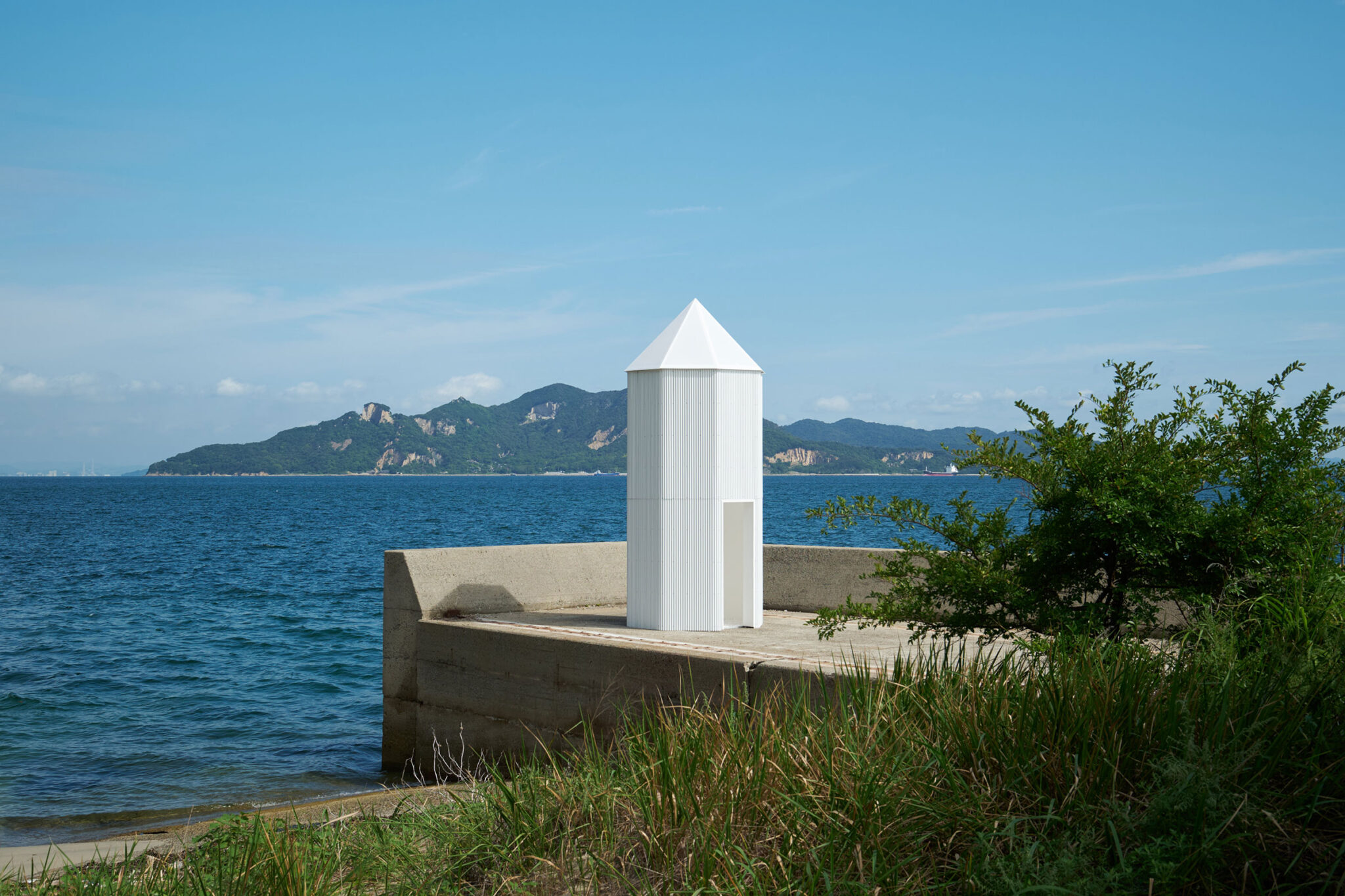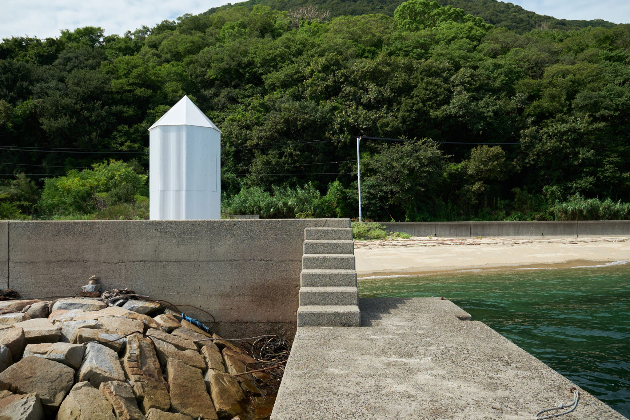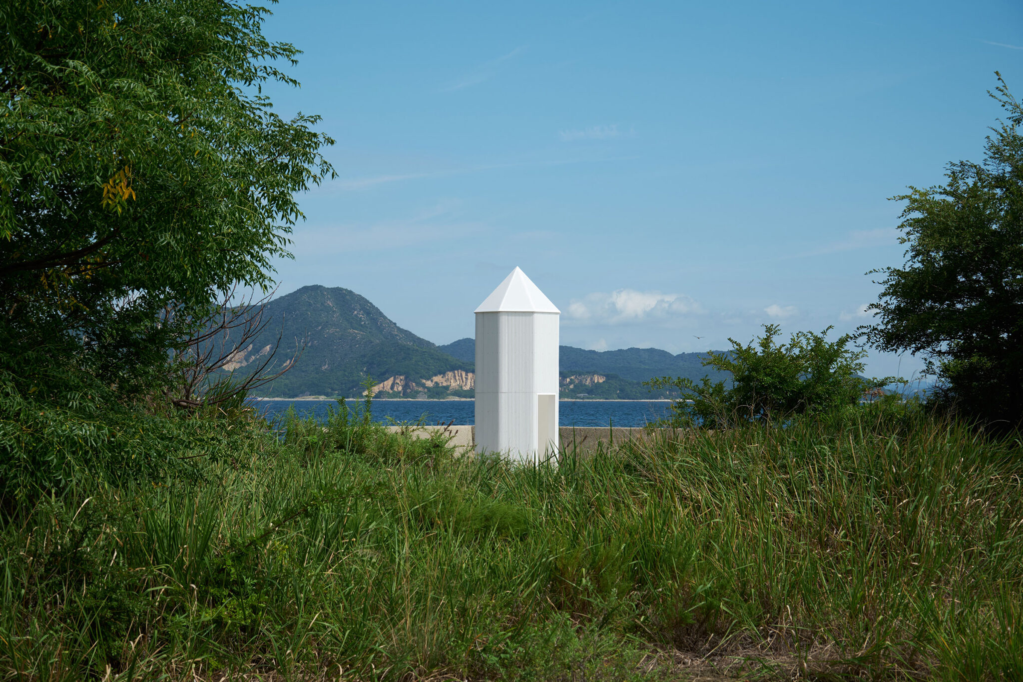 大室佑介アトリエによる、香川・多度津町の「鳥のための塔」。アート祭への出展作品として計画。“雄大な自然への敬意”と“墓地に近接する立地”も考慮し、島の一部となる“ささやかな塔”を志向。正八角形の柱の中に“円筒状”の内部空間を作って中谷ミチコのレリーフを配置海側より島全体を見る。 photo©若林勇人