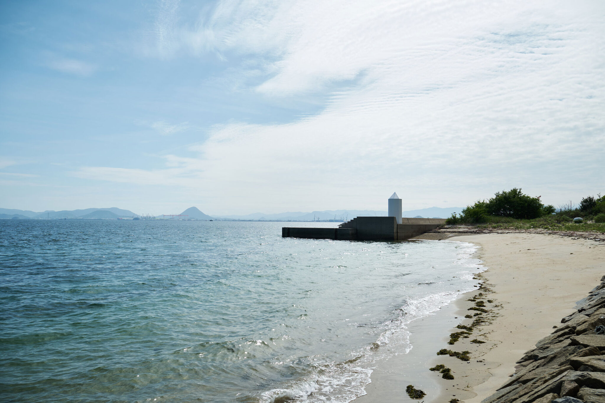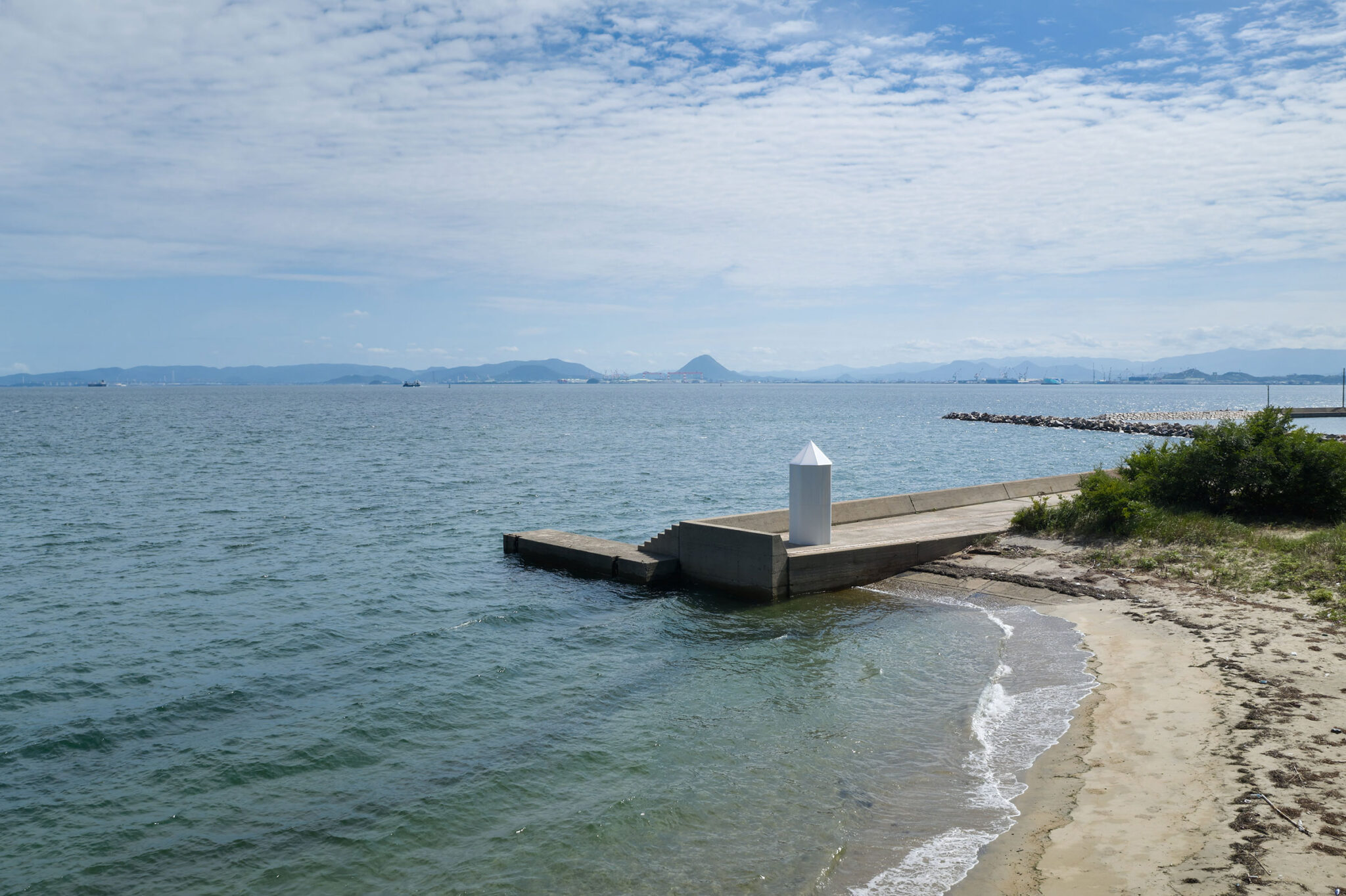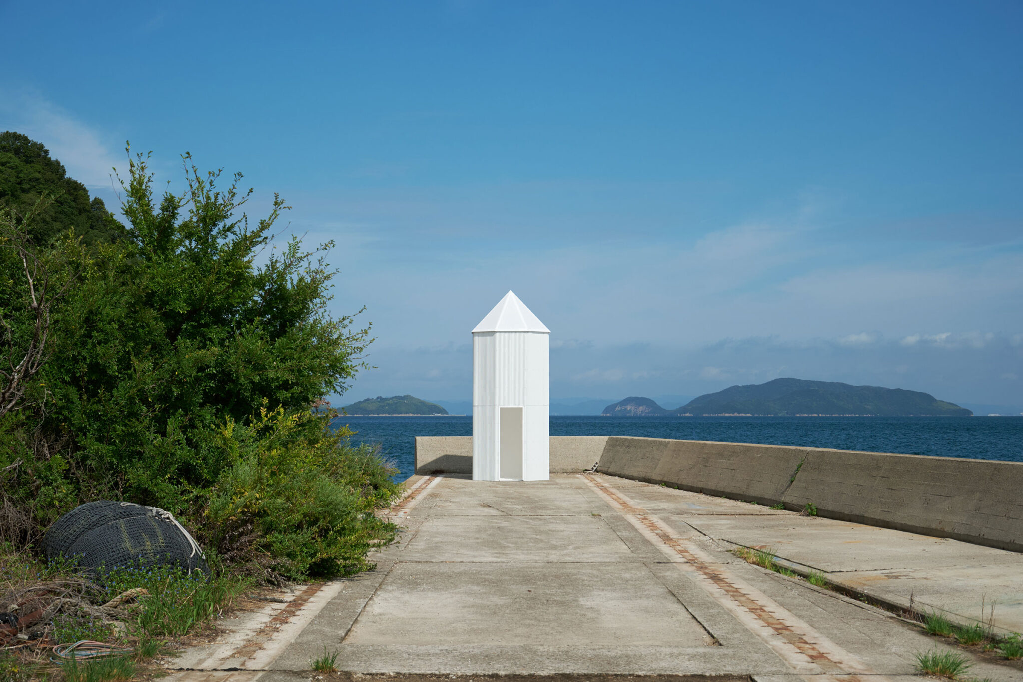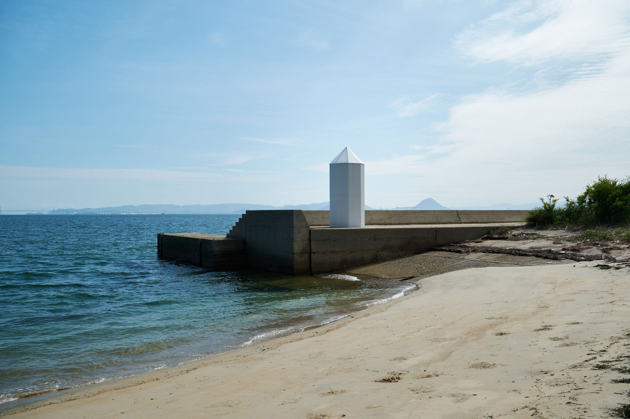 大室佑介アトリエによる、香川・多度津町の「鳥のための塔」。アート祭への出展作品として計画。“雄大な自然への敬意”と“墓地に近接する立地”も考慮し、島の一部となる“ささやかな塔”を志向。正八角形の柱の中に“円筒状”の内部空間を作って中谷ミチコのレリーフを配置海側より島全体を見る。 photo©若林勇人