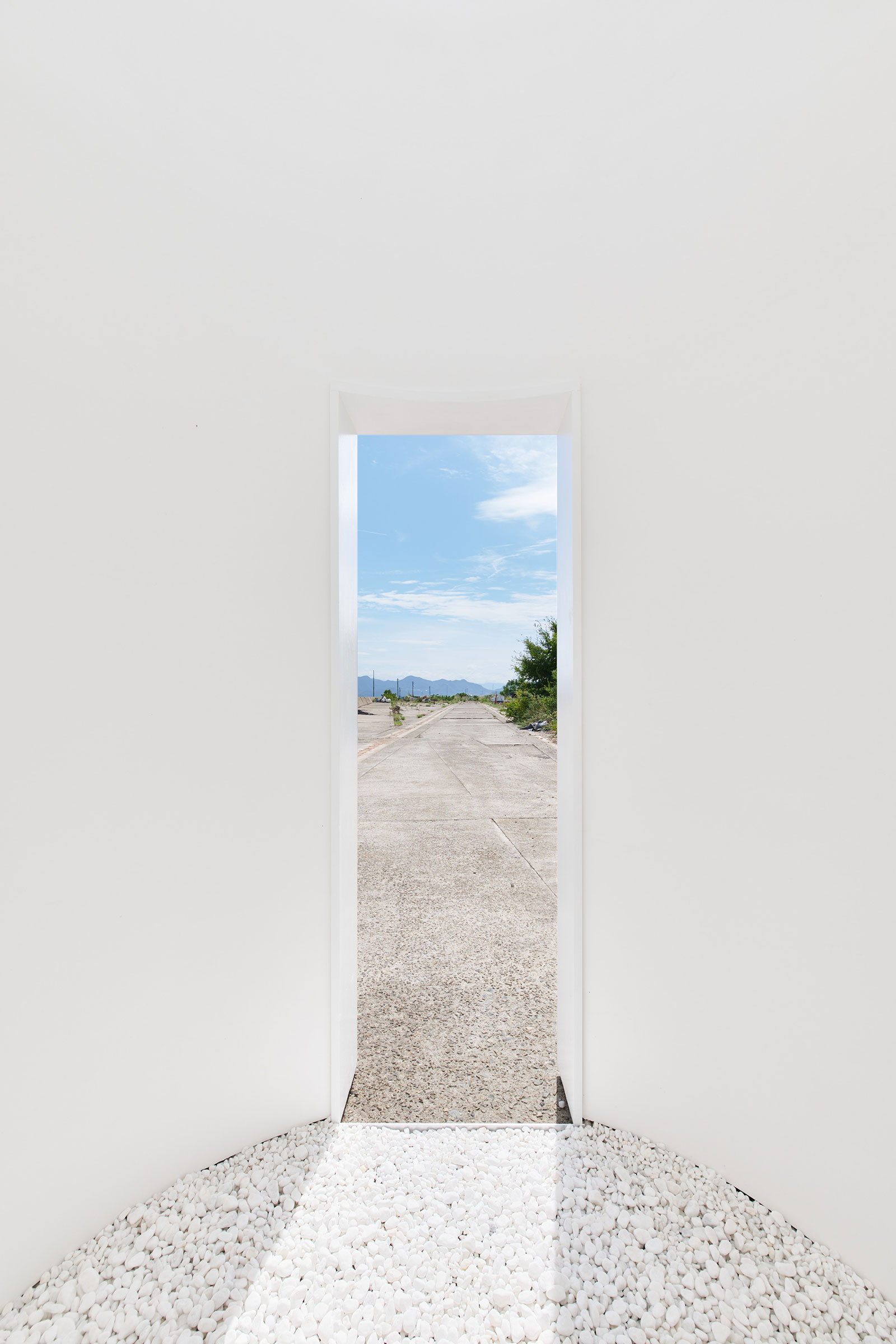 1:1+1.618の縦横比で穿たれた開口から入ると、内部はφ1,500mmの円筒状になっており、半透明の屋根から注ぐ自然光が漆喰塗りの壁面をなぞって光の井戸のような空間を形成している。