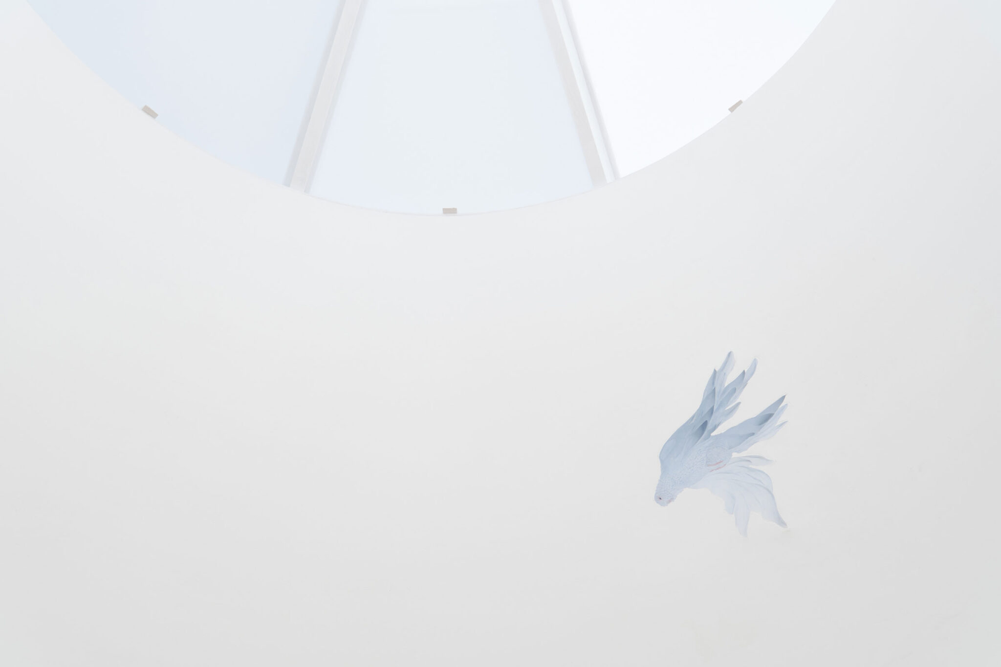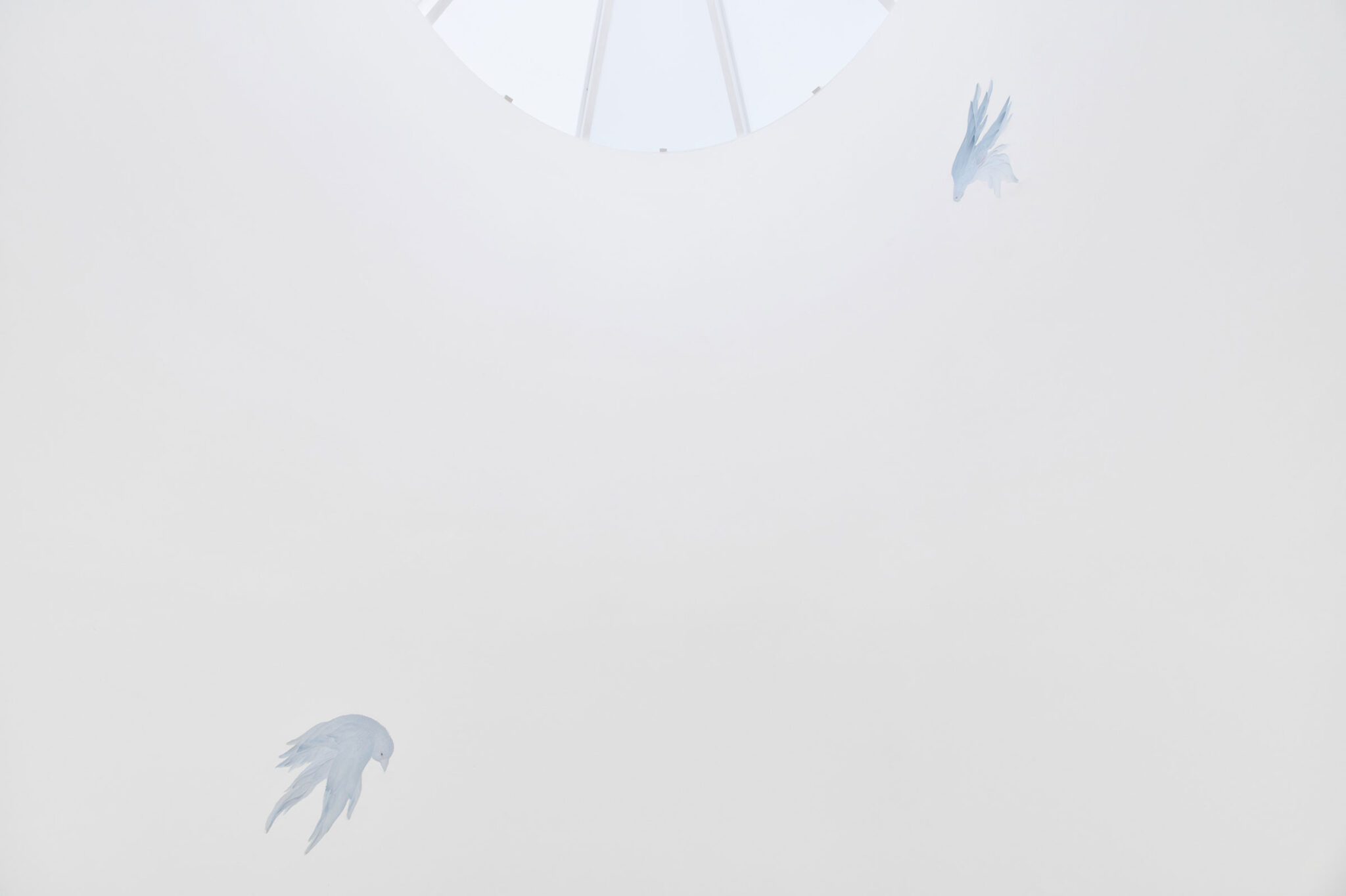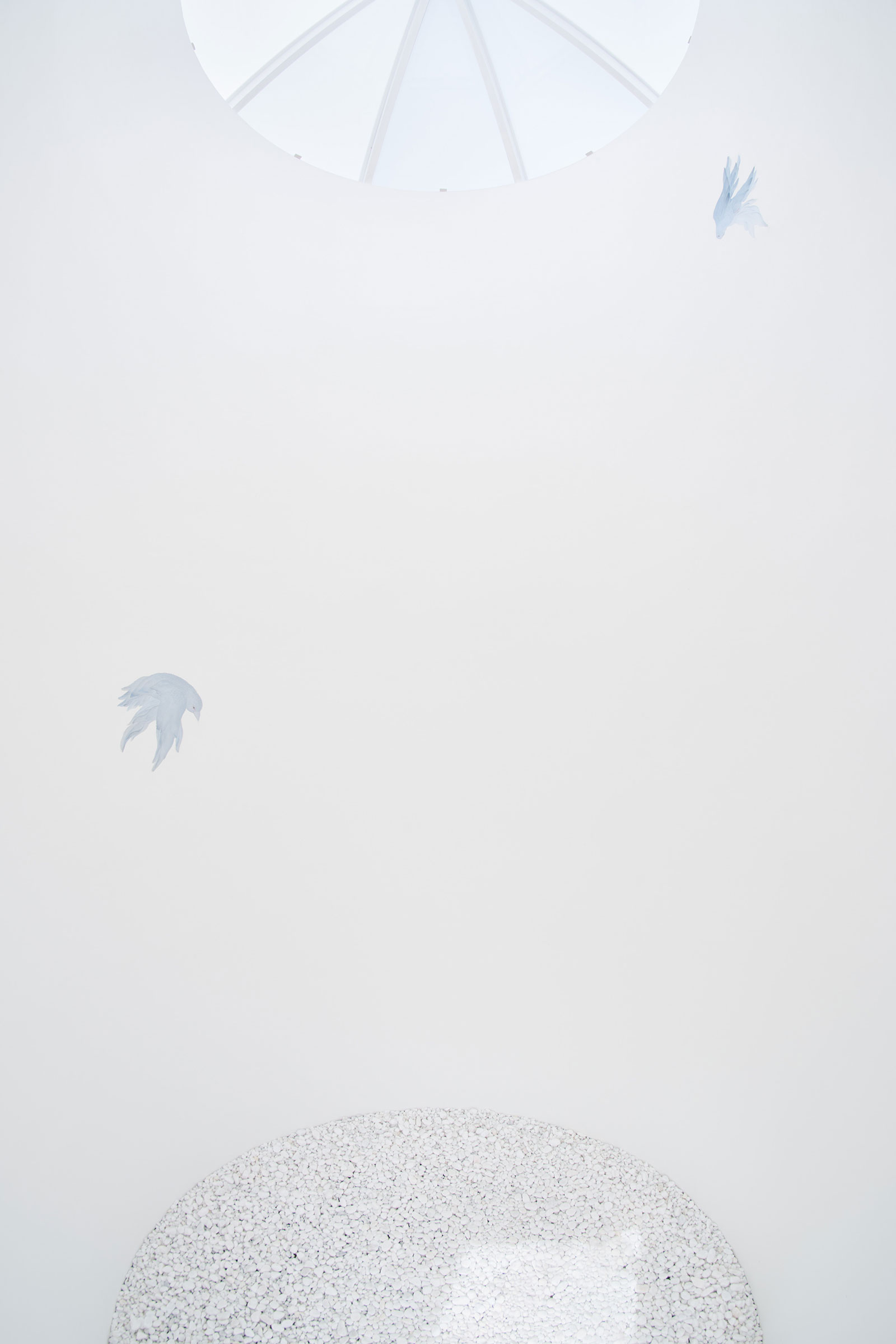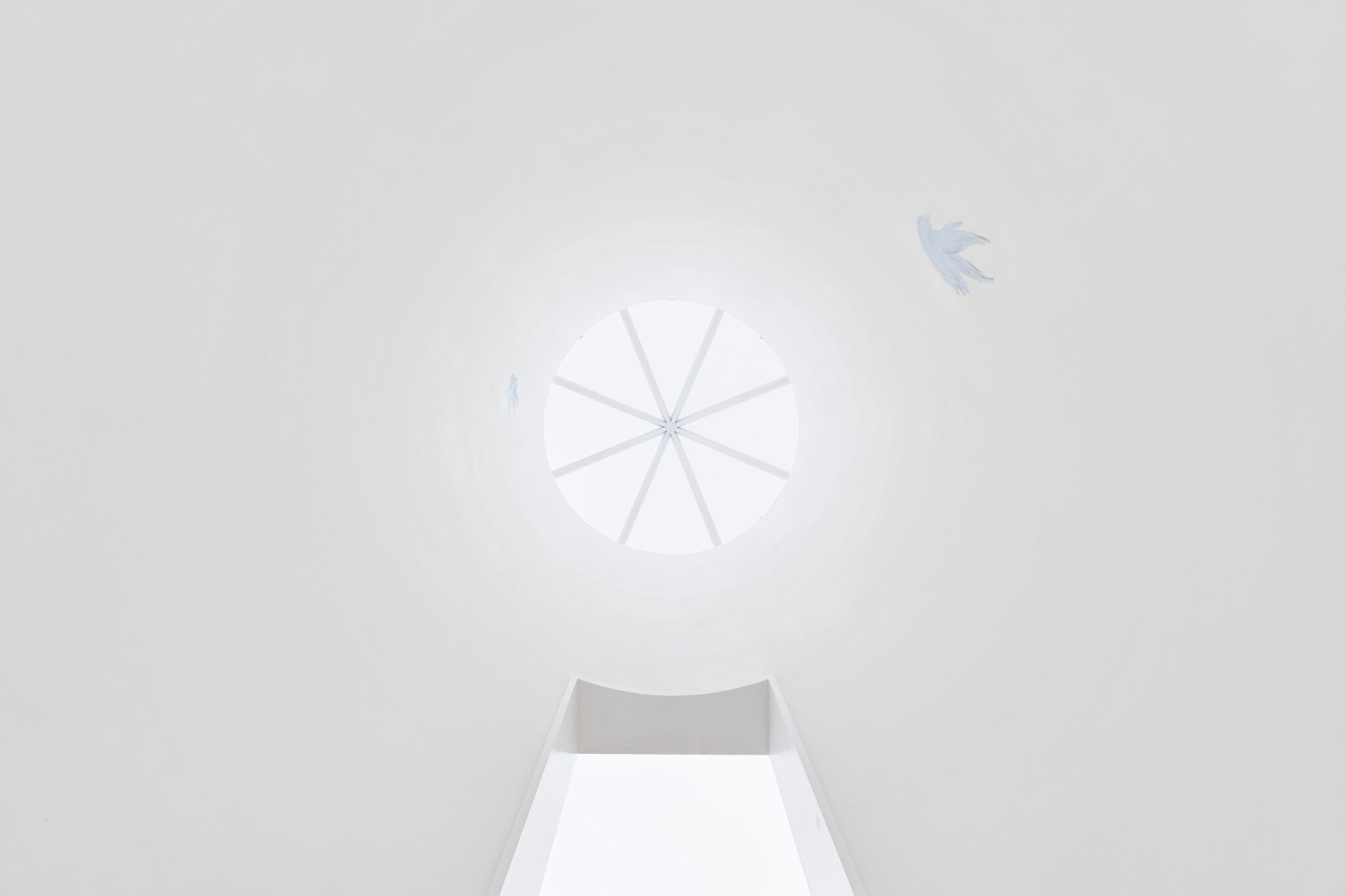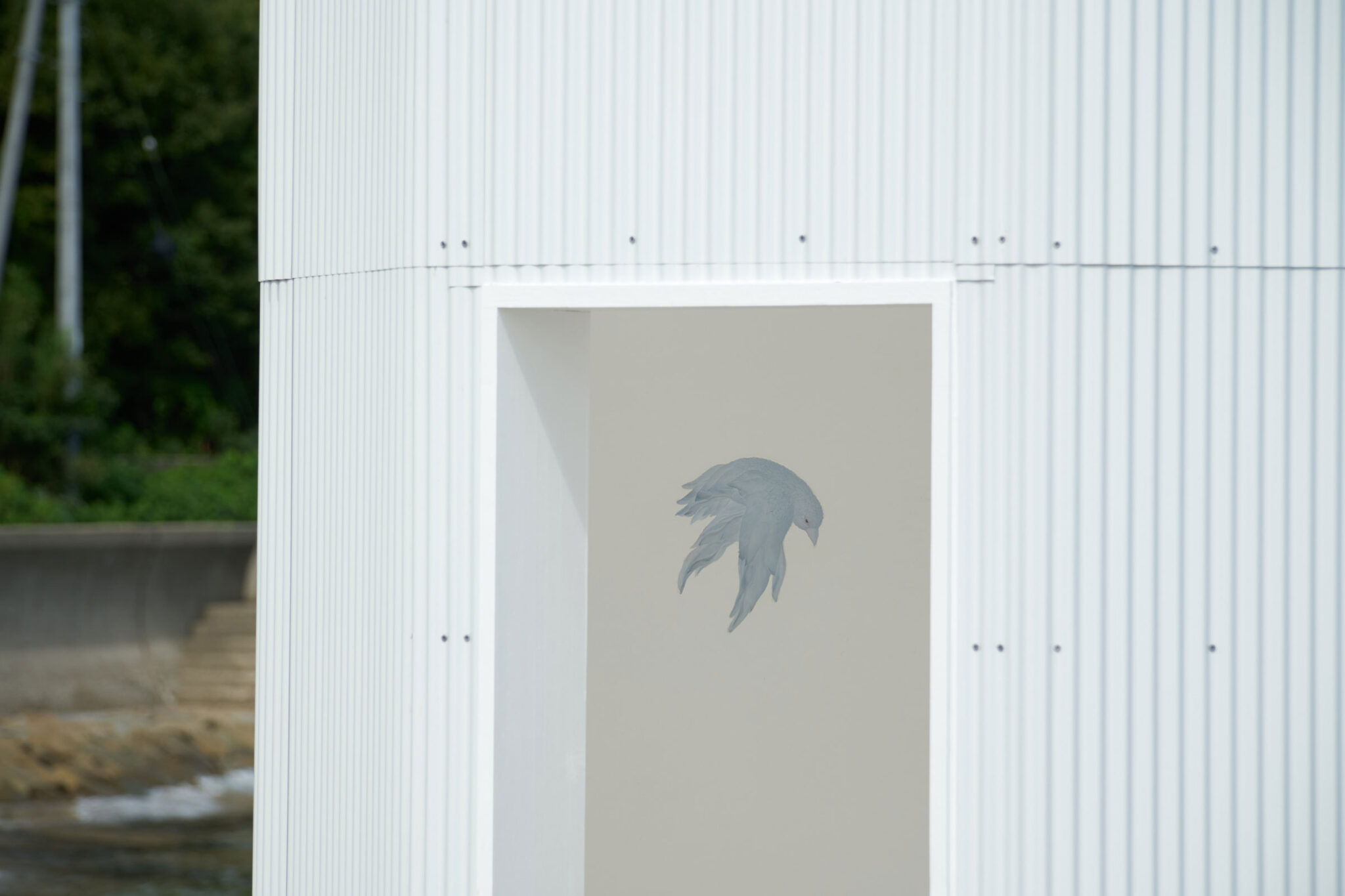 湾曲した壁面には彫刻家・中谷ミチコによる凹型のレリーフ作品「青い鳥」が二羽埋め込まれており、その表面に充填された透明樹脂の反射も相まって、静謐な内部空間に微かな揺らぎを与え、水平に広がる瀬戸内海の景色から遮断された垂直の展示空間は、作品と一対一で向き合い、自然の奏でる音や光を享受するための装置となっている。