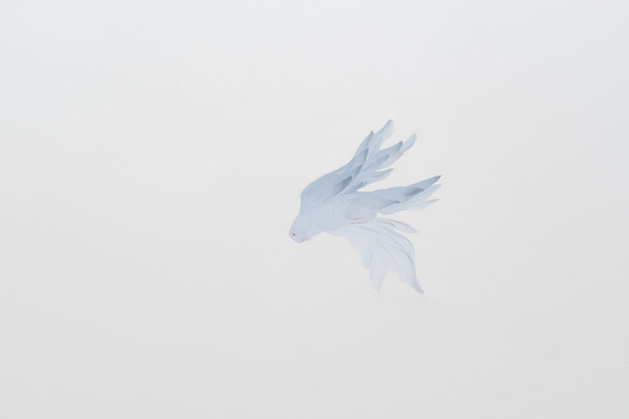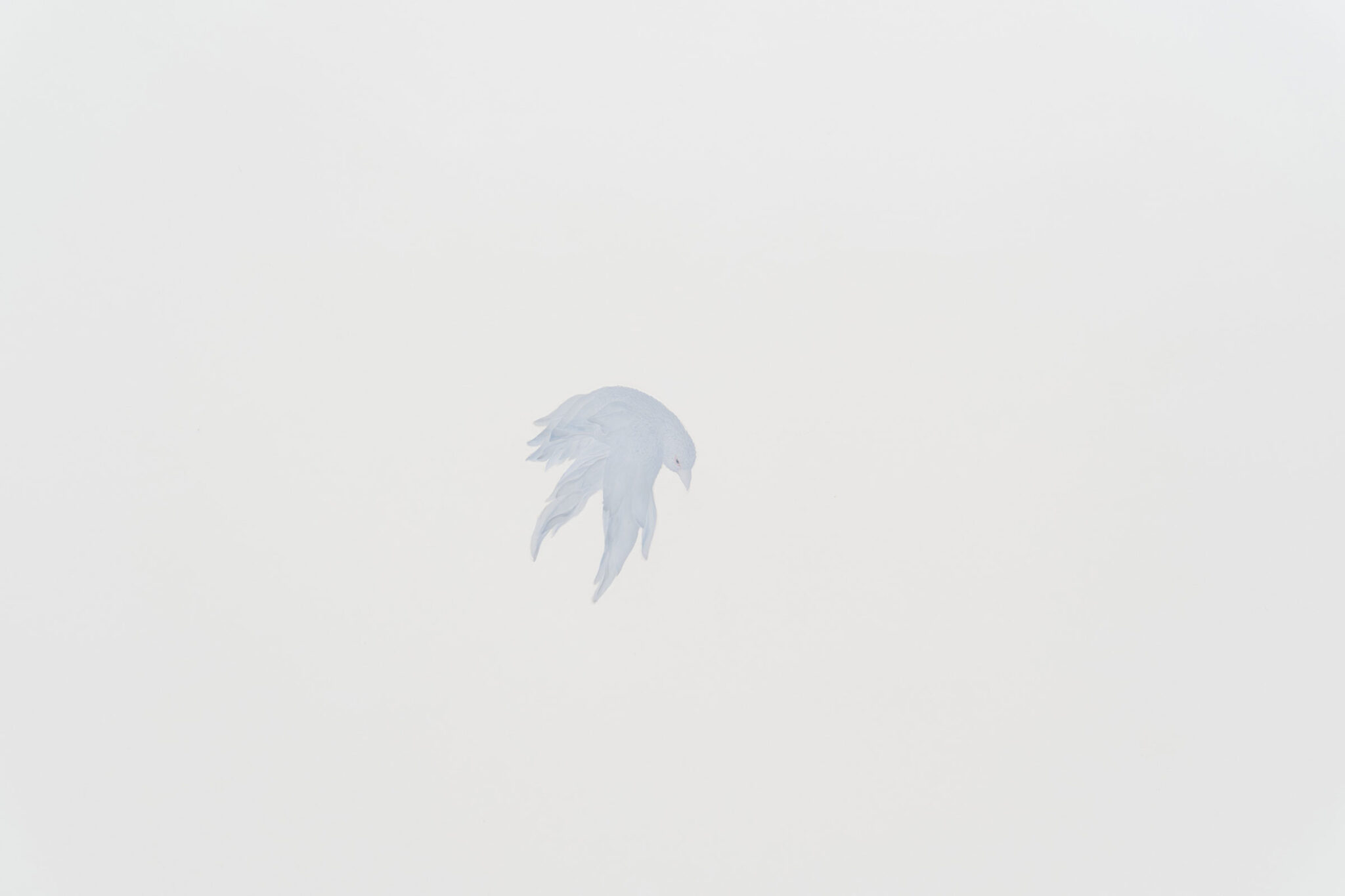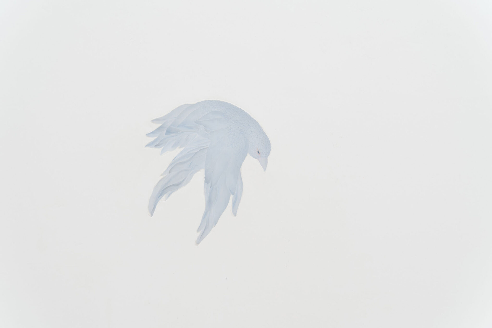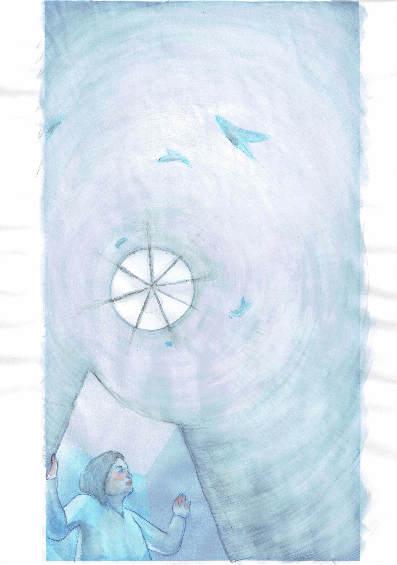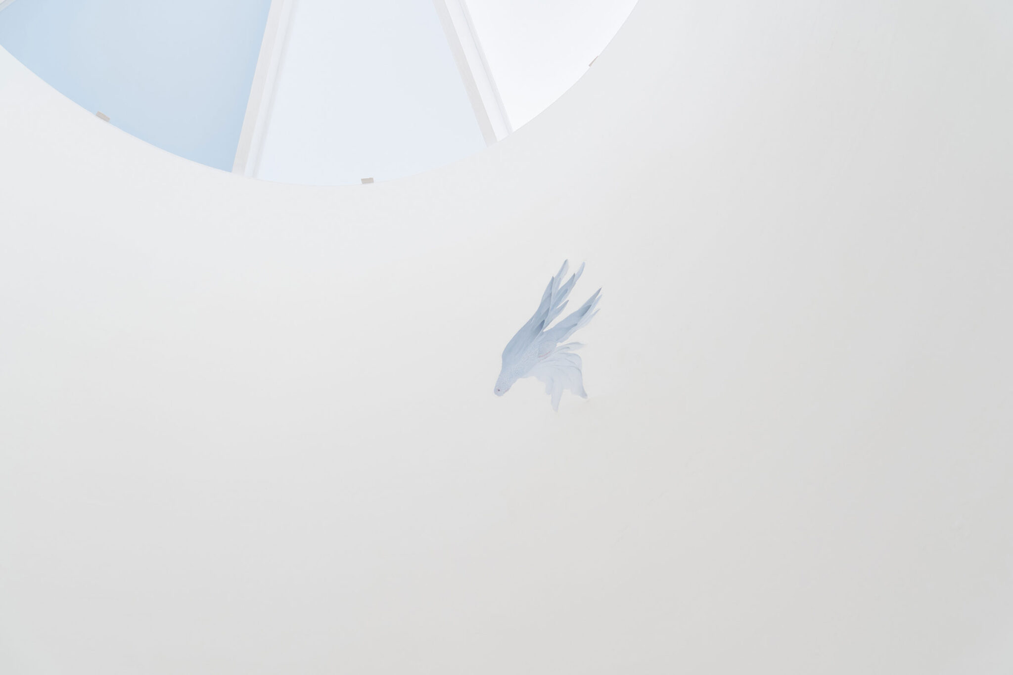 湾曲した壁面には彫刻家・中谷ミチコによる凹型のレリーフ作品「青い鳥」が二羽埋め込まれており、その表面に充填された透明樹脂の反射も相まって、静謐な内部空間に微かな揺らぎを与え、水平に広がる瀬戸内海の景色から遮断された垂直の展示空間は、作品と一対一で向き合い、自然の奏でる音や光を享受するための装置となっている。