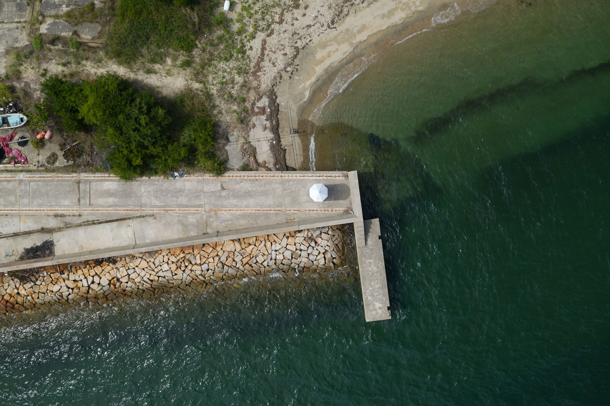 大室佑介アトリエによる、香川・多度津町の「鳥のための塔」。アート祭への出展作品として計画。“雄大な自然への敬意”と“墓地に近接する立地”も考慮し、島の一部となる“ささやかな塔”を志向。正八角形の柱の中に“円筒状”の内部空間を作って中谷ミチコのレリーフを配置鳥瞰、敷地上空より見る。 photo©若林勇人