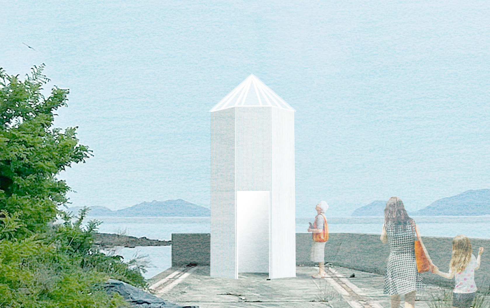 大室佑介アトリエによる、香川・多度津町の「鳥のための塔」。アート祭への出展作品として計画。“雄大な自然への敬意”と“墓地に近接する立地”も考慮し、島の一部となる“ささやかな塔”を志向。正八角形の柱の中に“円筒状”の内部空間を作って中谷ミチコのレリーフを配置外観イメージ image©大室佑介アトリエ / atelier Ichiku