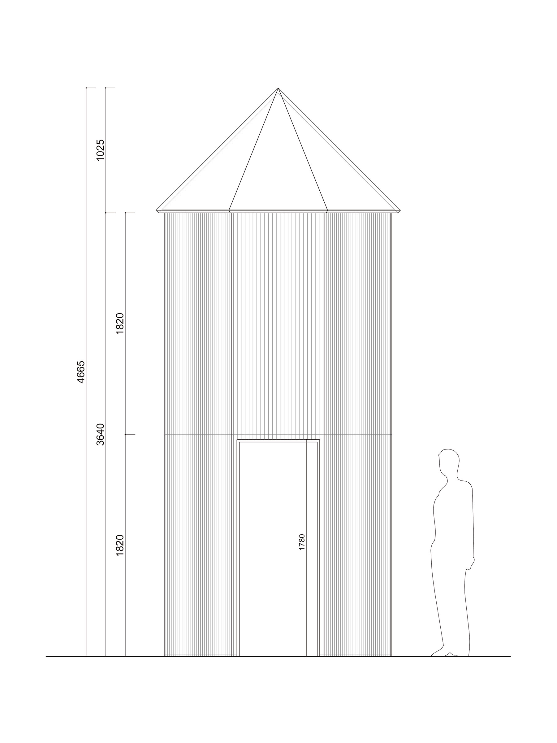 大室佑介アトリエによる、香川・多度津町の「鳥のための塔」。アート祭への出展作品として計画。“雄大な自然への敬意”と“墓地に近接する立地”も考慮し、島の一部となる“ささやかな塔”を志向。正八角形の柱の中に“円筒状”の内部空間を作って中谷ミチコのレリーフを配置立面図 image©大室佑介アトリエ / atelier Ichiku