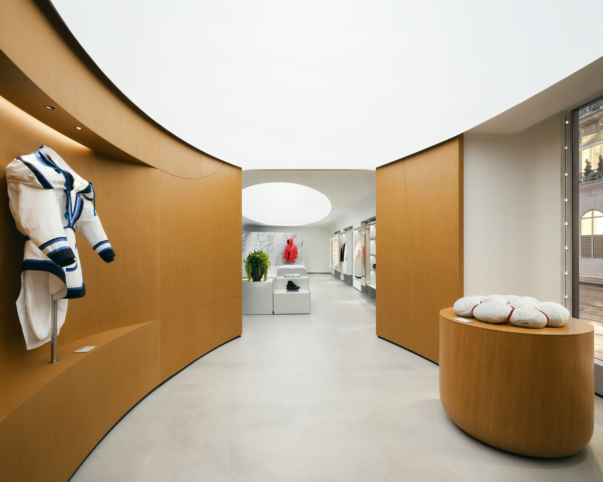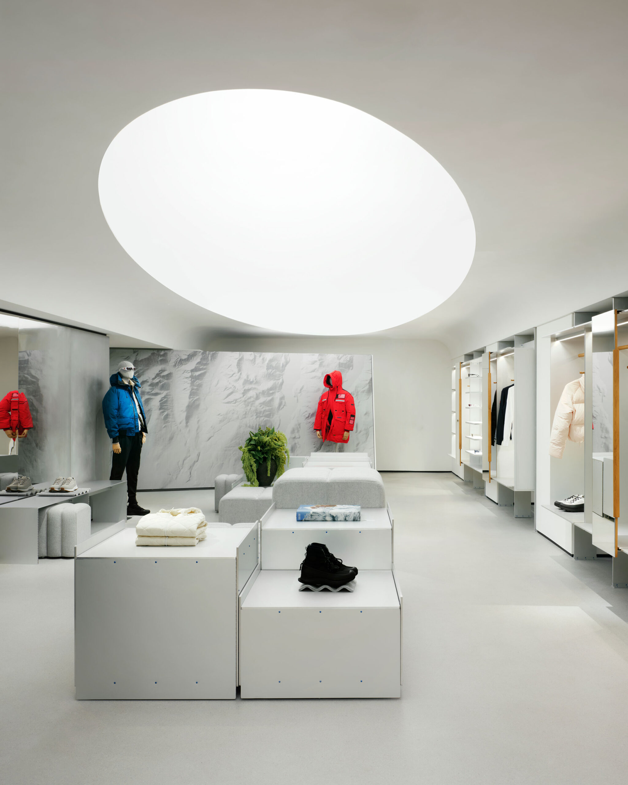 スノヘッタによる、フランス・パリの店舗「Canada Goose Paris」。ファッションダウンブランドの旗艦店。“境界のない”というコンセプトを掲げ、シグネチャールックに根ざしながら“美的表現を超える”空間を志向。インテリアからデザインガイドラインまで包括的に手掛ける photo©Ludovic Balay