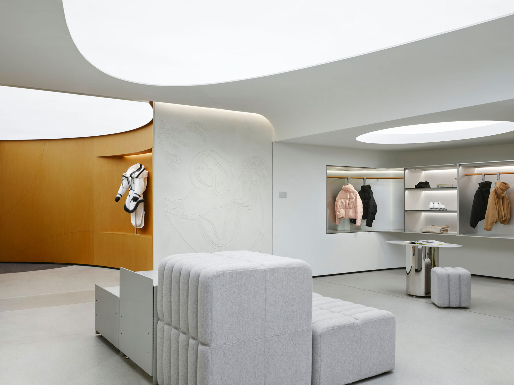 フォワイエを抜けたすぐ先には、カナダグースの「プロジェクト・アティギ」より「ロングテイル・アマウティ(2019)」が展示されています。これは、保温性と防護性の頂点として展示されており、最初のパーカを生み出したイヌイットのデザインを称える、柔らかな鎧の一形態です。この考えは、私たちの素材と空間のパレットにも広がっており、それは触覚的で、強靭で、洗練されています。店舗は、まばらな展示と、より没入感のある層状の環境との間を行き来し、製品が呼吸することも、存在感を強めることも可能にしています。エントランスを飾るのは、カナダ北極圏出身のイヌクのアーティストで作家のニンギウクル・ティービー(Ningiukulu Teevee)によるオリジナルドローイング「Tiptoe Through the Tundra」であり、それは印象的な大規模な漆喰の壁画として再構成されています。この構図は、豊かに装飾された衣服を繊細かつ図像的に描写することで、最初のパーカである伝統的なアマウティを称えています。