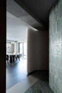 沼田祐子 / YNASによる、東京・渋谷区の住戸改修「神宮のスタジオ / 自邸」。共用部の光庭や動線が特徴的な集合住宅での計画。外の空間性の内への導入を求め、光を拡散して全体を緩やかに繋げる“曲面壁”を中心に据える構成を考案。歴史も読み込んだ創造で“住み継ぐ”選択肢の提示も意図玄関側から洗面エリアを見る。 photo©西川公朗