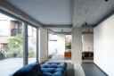 くつろぐリビングエリアはアウトドアリビングの奥行と道路との高低差により、歩行者からは見えないが、内部からは空が見える。集中して作業をするスタディエリアは隣地と共有している歩行者のほとんどいない庭に面し、地面に近い距離で植栽等を望む。