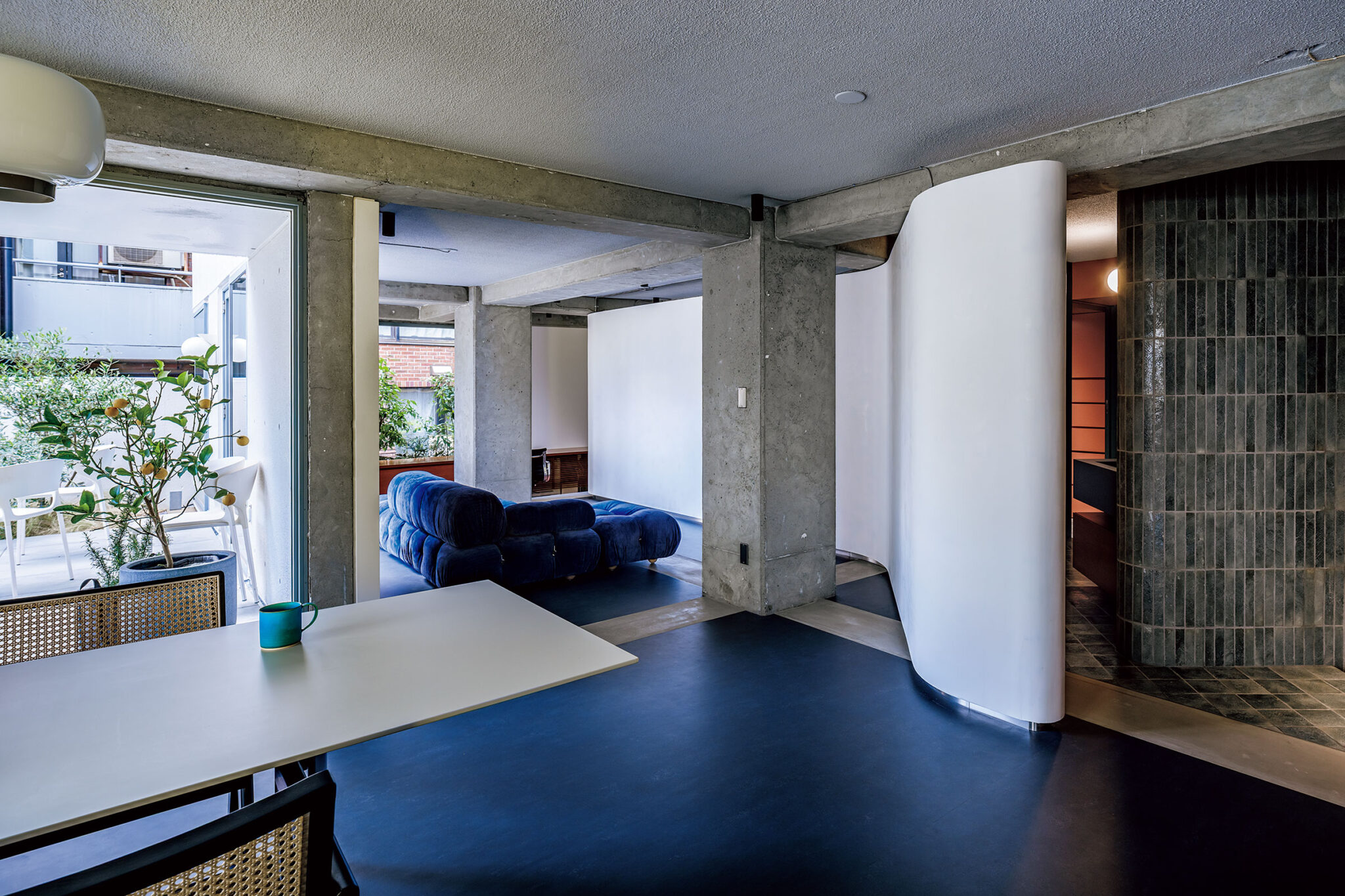 沼田祐子 / YNASによる、東京・渋谷区の住戸改修「神宮のスタジオ / 自邸」。共用部の光庭や動線が特徴的な集合住宅での計画。外の空間性の内への導入を求め、光を拡散して全体を緩やかに繋げる“曲面壁”を中心に据える構成を考案。歴史も読み込んだ創造で“住み継ぐ”選択肢の提示も意図ダイニングエリアから「アウトドアリビング」とリビングエリア側を見る。 photo©西川公朗