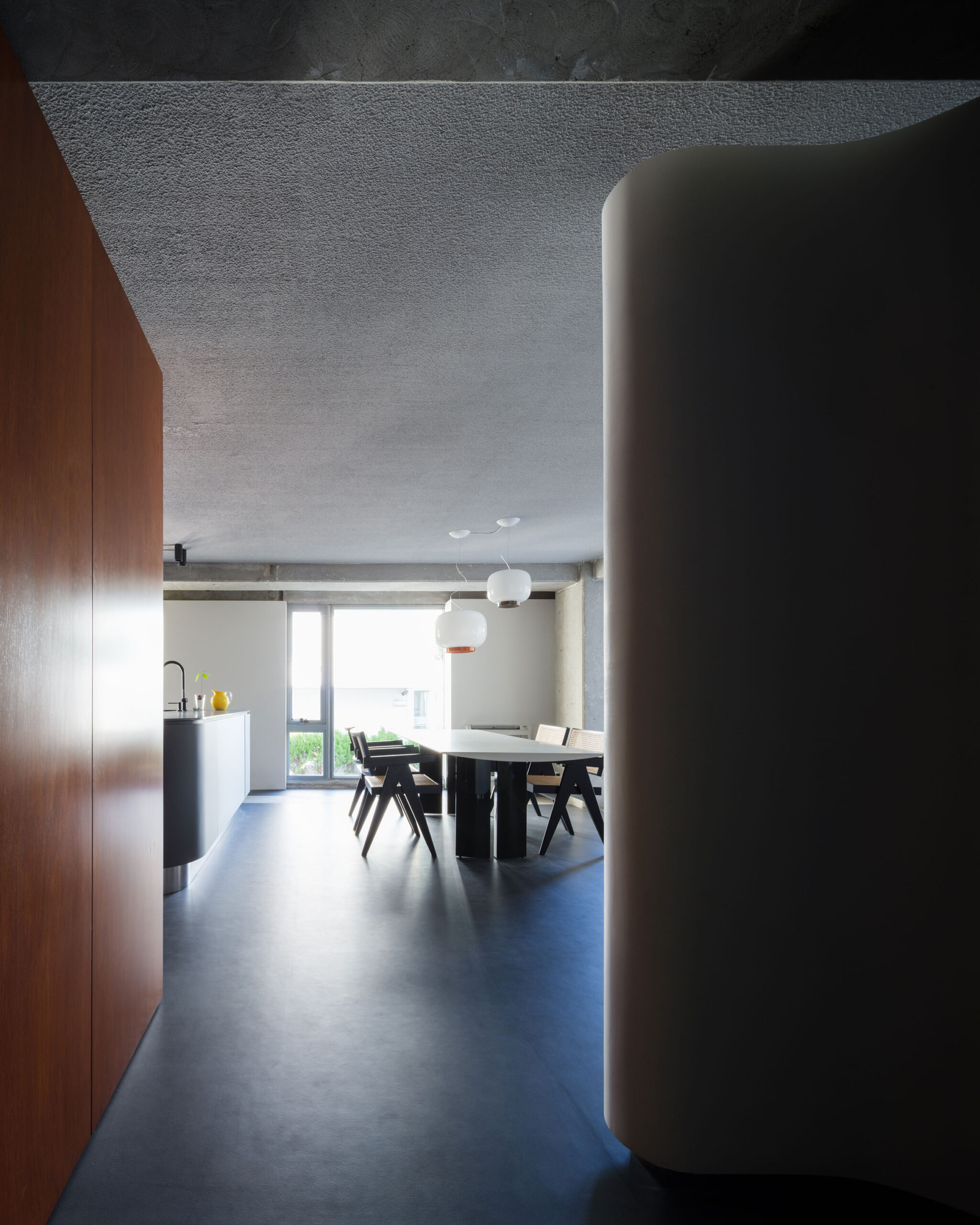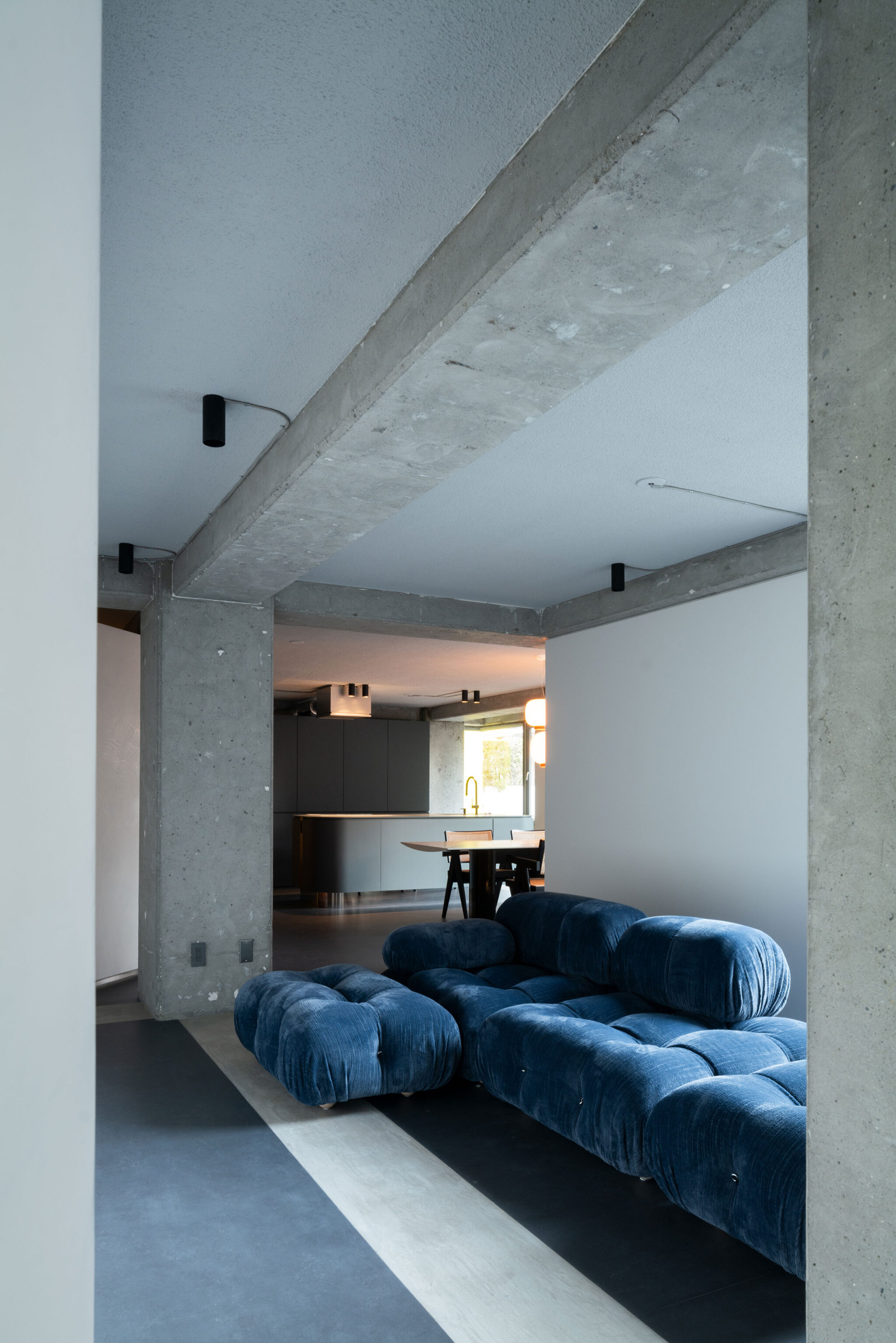50年前の床仕上げで隠蔽されていたが、床の梁が各住戸側に突出しており、600mm角の柱と共に、天井、床共に躯体を現し、床梁上端面と同面でフロアレベルを設定し直した。そして不整形な平面形状の空間にあえてグリッドからずらした1枚の曲面壁を設置した。曲面の先に続く空間の奥行を感じさせながらも視線を操作する。各エリアは廊下や建具を設けず、この壁を中心に半オープンな空間の連続として配置した。