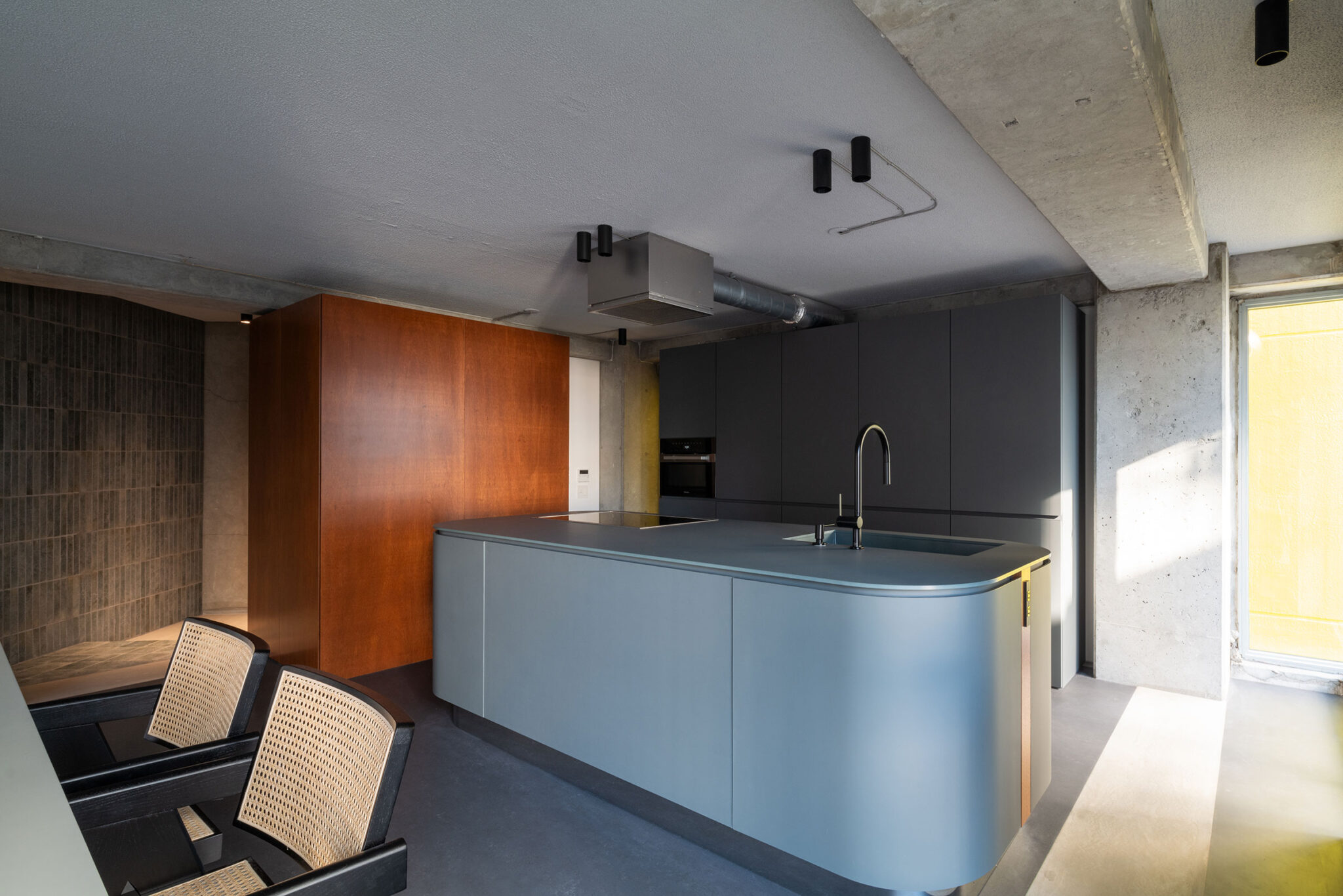 沼田祐子 / YNASによる、東京・渋谷区の住戸改修「神宮のスタジオ / 自邸」。共用部の光庭や動線が特徴的な集合住宅での計画。外の空間性の内への導入を求め、光を拡散して全体を緩やかに繋げる“曲面壁”を中心に据える構成を考案。歴史も読み込んだ創造で“住み継ぐ”選択肢の提示も意図キッチン photo©西川公朗