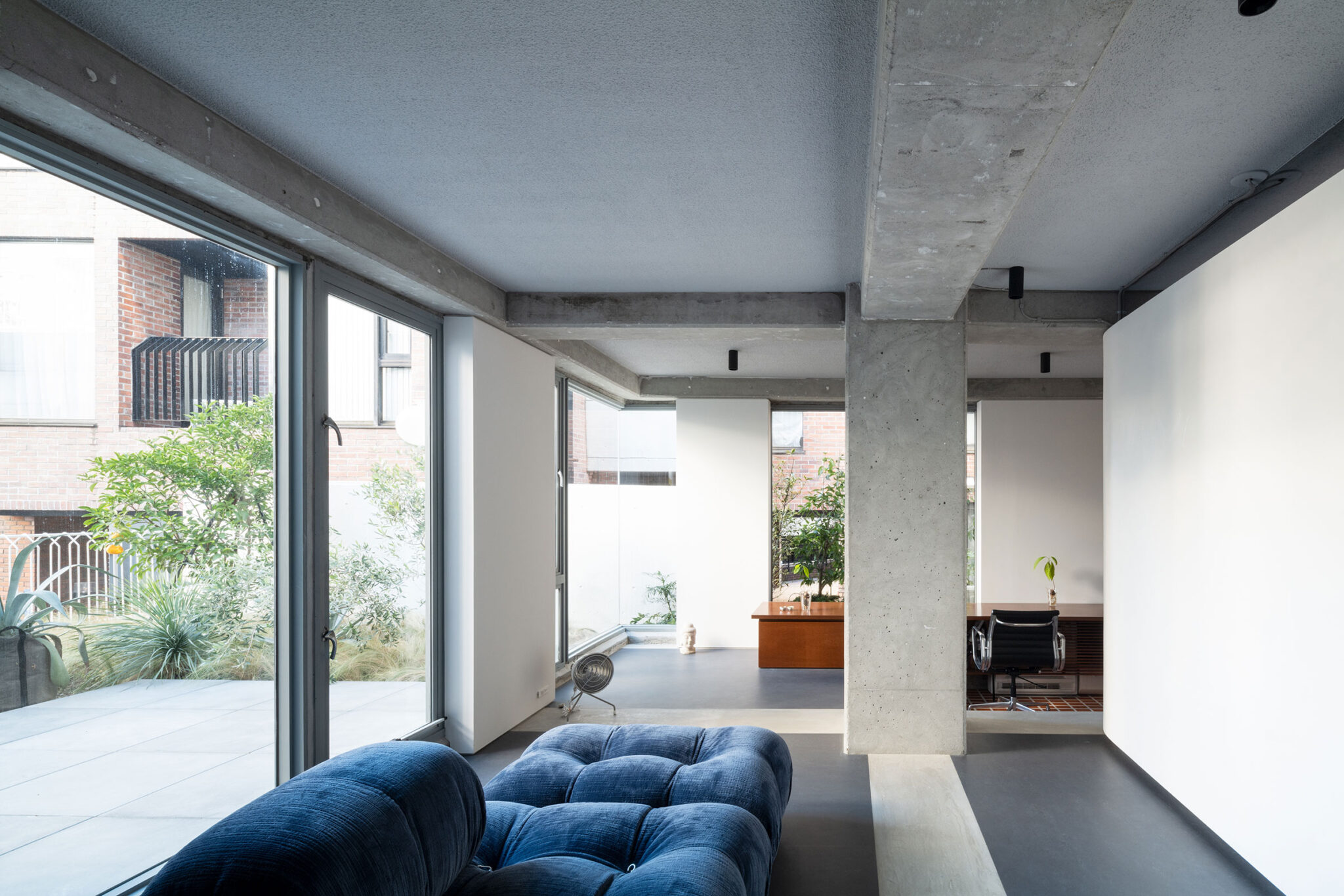 沼田祐子 / YNASによる、東京・渋谷区の住戸改修「神宮のスタジオ / 自邸」。共用部の光庭や動線が特徴的な集合住宅での計画。外の空間性の内への導入を求め、光を拡散して全体を緩やかに繋げる“曲面壁”を中心に据える構成を考案。歴史も読み込んだ創造で“住み継ぐ”選択肢の提示も意図スタディエリア側からリビングエリアを見る。 photo©西川公朗