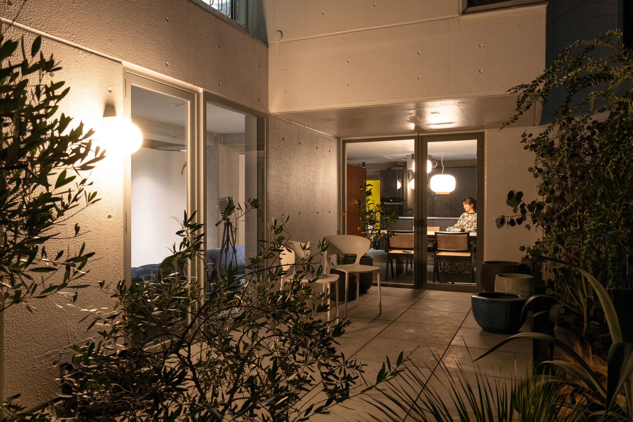 沼田祐子 / YNASによる、東京・渋谷区の住戸改修「神宮のスタジオ / 自邸」。共用部の光庭や動線が特徴的な集合住宅での計画。外の空間性の内への導入を求め、光を拡散して全体を緩やかに繋げる“曲面壁”を中心に据える構成を考案。歴史も読み込んだ創造で“住み継ぐ”選択肢の提示も意図「アウトドアリビング」。夜景 photo©西川公朗
