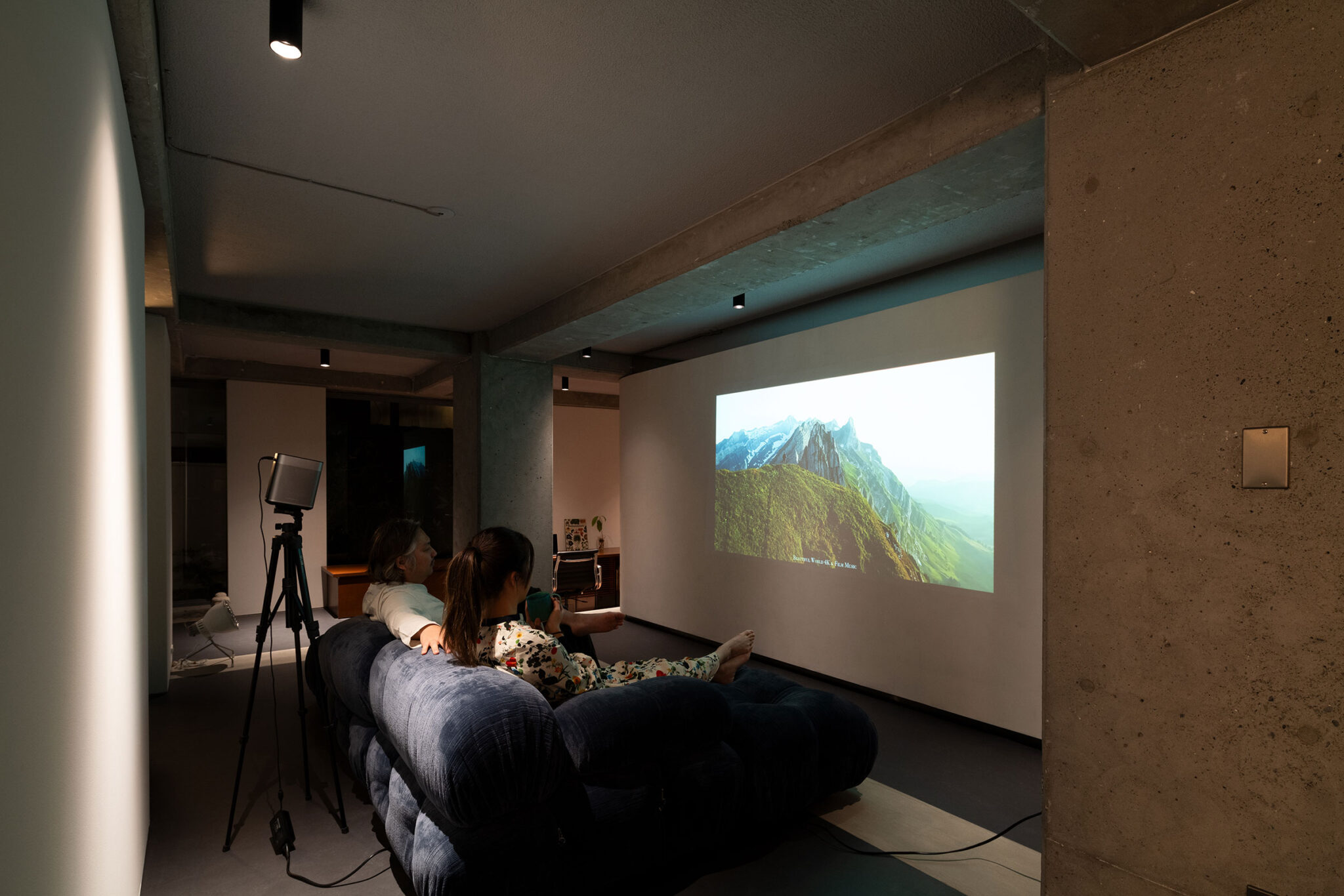 キッチンとダイニングエリアはミーティングスペース、リビングはプロジェクター投影で映像確認やホワイトバック撮影の空間も兼ねる。スタディエリアは逆梁躯体を生かし、他の床より320mm下げ、長さ5.5mのデスクと本棚を設置し、開口部への圧迫感を低減しつつ、窪みの籠り空間を形成した。集中して本を読む場にも、段差に腰かけながら数人での議論の場にもなる。