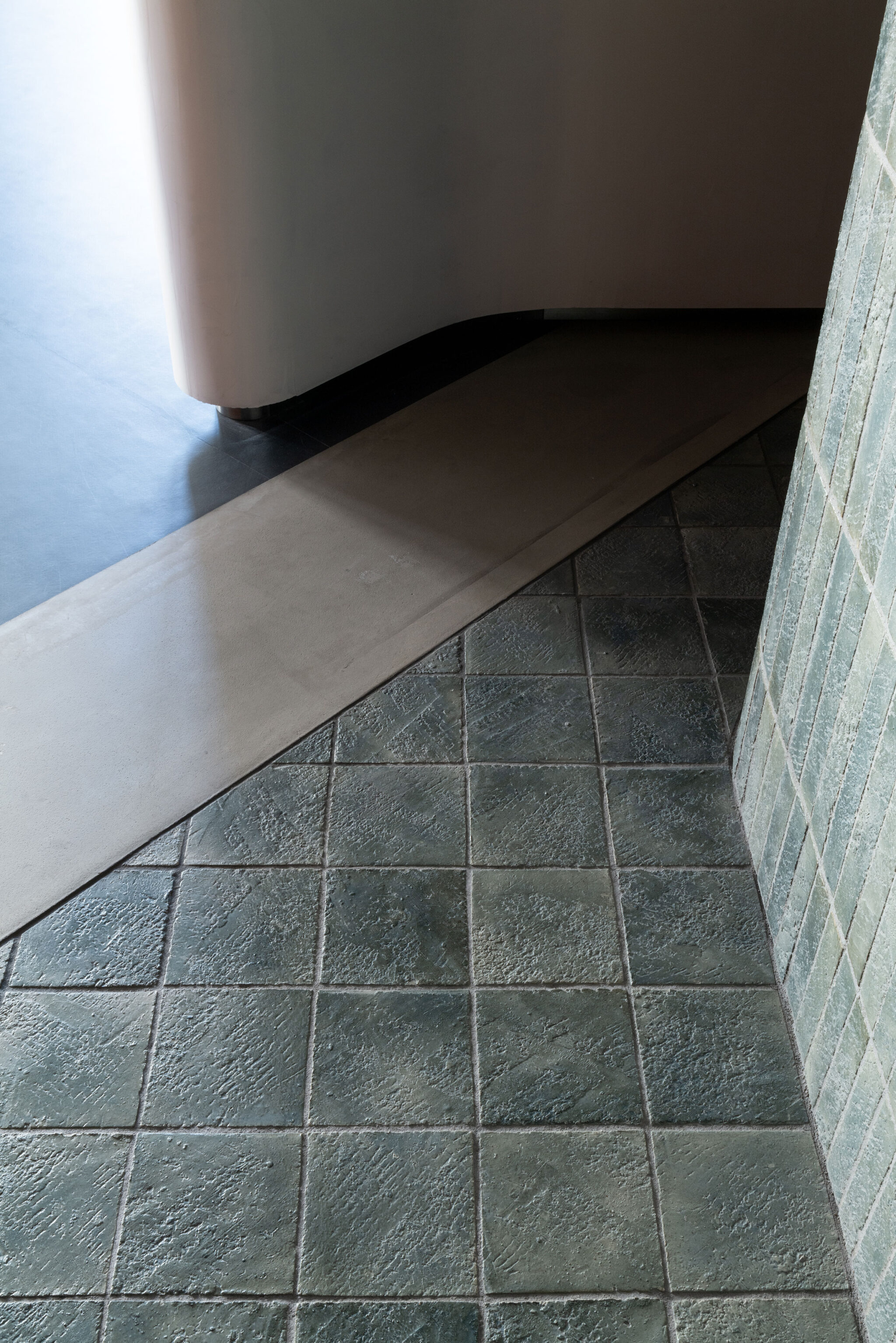 沼田祐子 / YNASによる、東京・渋谷区の住戸改修「神宮のスタジオ / 自邸」。共用部の光庭や動線が特徴的な集合住宅での計画。外の空間性の内への導入を求め、光を拡散して全体を緩やかに繋げる“曲面壁”を中心に据える構成を考案。歴史も読み込んだ創造で“住み継ぐ”選択肢の提示も意図玄関付近の床の詳細 photo©西川公朗