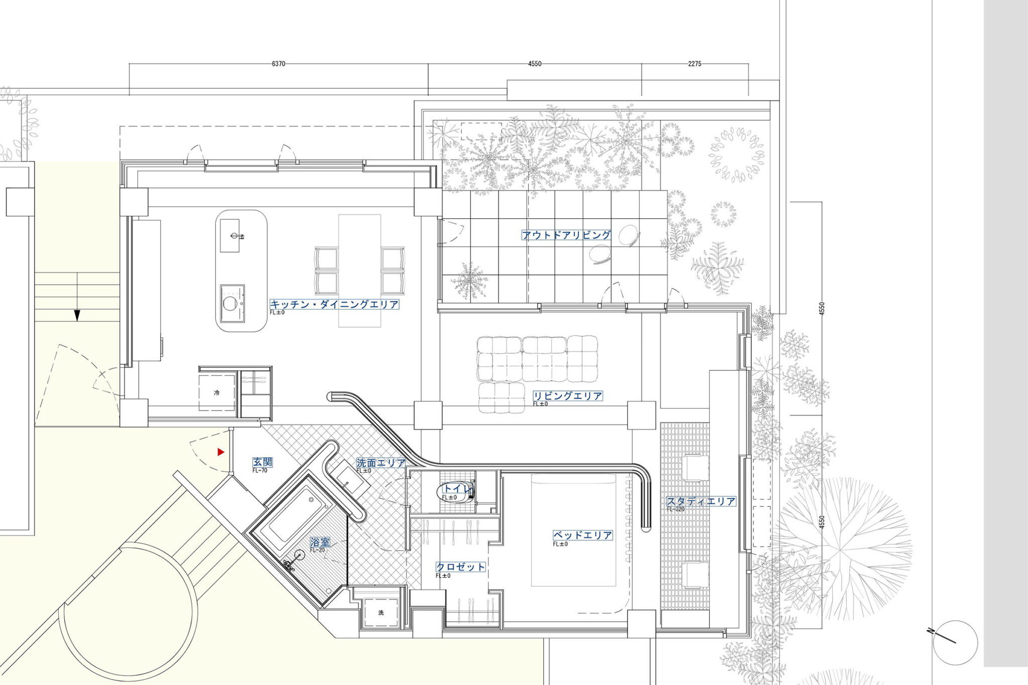くつろぐリビングエリアはアウトドアリビングの奥行と道路との高低差により、歩行者からは見えないが、内部からは空が見える。集中して作業をするスタディエリアは隣地と共有している歩行者のほとんどいない庭に面し、地面に近い距離で植栽等を望む。