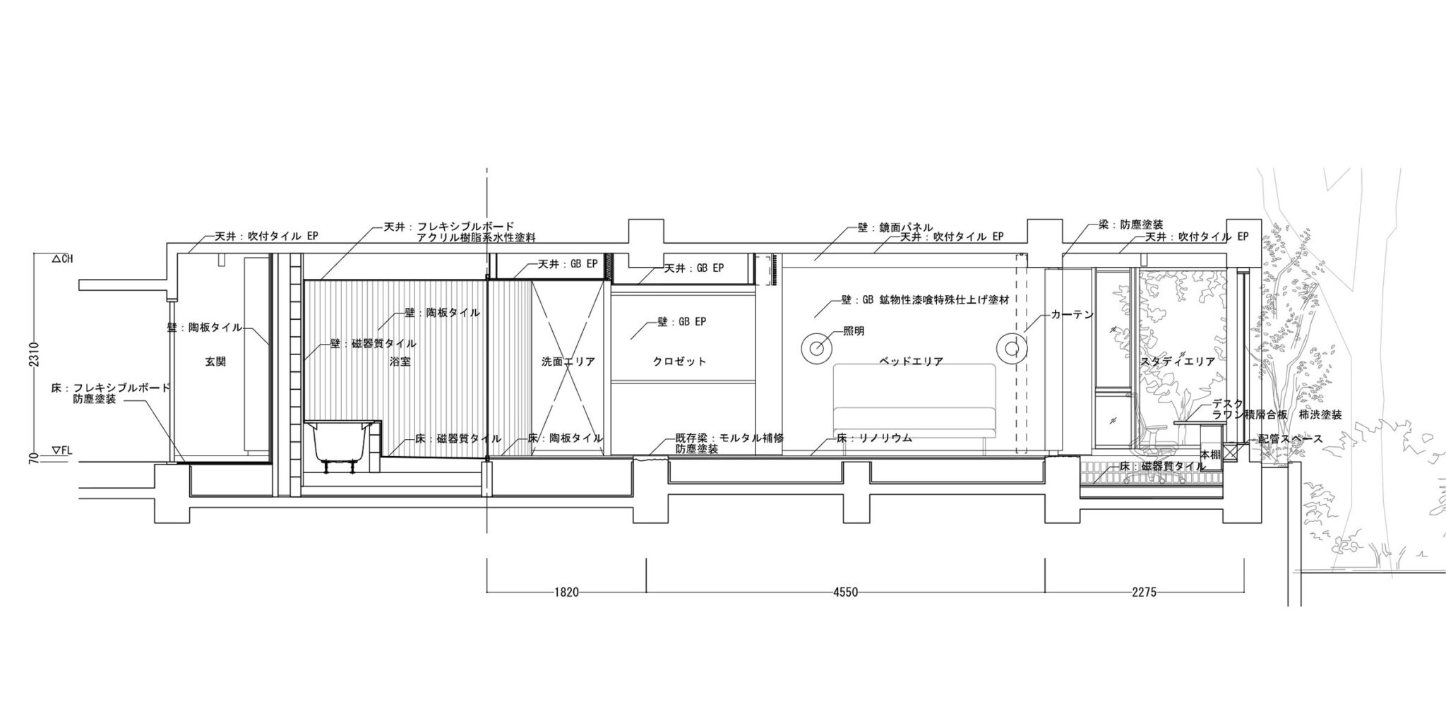 | 内装・天井 | ベッドエリア 天井 | 既存躯体の上吹付タイル+EP