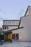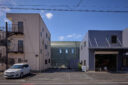 宮崎晃吉 / HAGISOによる、群馬の住宅「前橋の道の輪郭」。路地状の共有地などが見られる街区での計画。建築の時間と住み手の時間との折合いも主題とし、読み替えられながらも生き続ける存在を志向。路地の延長線上の“たまり”となる中庭の周りに諸室を配置する建築を考案外観、南側の道路より見る。 photo©楠瀬友将