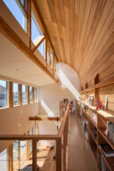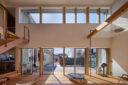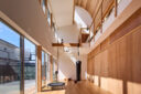 宮崎晃吉 / HAGISOによる、群馬の住宅「前橋の道の輪郭」。路地状の共有地などが見られる街区での計画。建築の時間と住み手の時間との折合いも主題とし、読み替えられながらも生き続ける存在を志向。路地の延長線上の“たまり”となる中庭の周りに諸室を配置する建築を考案2階、廊下から「アリーナ」の吹抜を見る。 photo©楠瀬友将