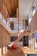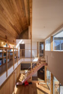 宮崎晃吉 / HAGISOによる、群馬の住宅「前橋の道の輪郭」。路地状の共有地などが見られる街区での計画。建築の時間と住み手の時間との折合いも主題とし、読み替えられながらも生き続ける存在を志向。路地の延長線上の“たまり”となる中庭の周りに諸室を配置する建築を考案1階、「アリーナ」から2階への階段を見る。 photo©楠瀬友将