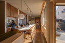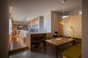 宮崎晃吉 / HAGISOによる、群馬の住宅「前橋の道の輪郭」。路地状の共有地などが見られる街区での計画。建築の時間と住み手の時間との折合いも主題とし、読み替えられながらも生き続ける存在を志向。路地の延長線上の“たまり”となる中庭の周りに諸室を配置する建築を考案1階、左奥:キッチン、手前:玄関、右:「スタディ」 photo©楠瀬友将