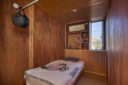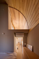 曲面壁の裏地としての内部仕上げはラワン合板の下見板張とし、書棚に並ぶ本や華奢な手すりとともに、無機質でシームレスな外観に対してスケールを落としている。