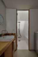 宮崎晃吉 / HAGISOによる、群馬の住宅「前橋の道の輪郭」。路地状の共有地などが見られる街区での計画。建築の時間と住み手の時間との折合いも主題とし、読み替えられながらも生き続ける存在を志向。路地の延長線上の“たまり”となる中庭の周りに諸室を配置する建築を考案2階、浴室から脱衣室側を見る。 photo©楠瀬友将