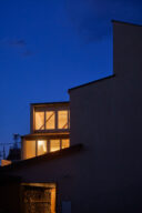 宮崎晃吉 / HAGISOによる、群馬の住宅「前橋の道の輪郭」。路地状の共有地などが見られる街区での計画。建築の時間と住み手の時間との折合いも主題とし、読み替えられながらも生き続ける存在を志向。路地の延長線上の“たまり”となる中庭の周りに諸室を配置する建築を考案外観、敷地内の南側より見る。夜景 photo©楠瀬友将