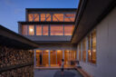 宮崎晃吉 / HAGISOによる、群馬の住宅「前橋の道の輪郭」。路地状の共有地などが見られる街区での計画。建築の時間と住み手の時間との折合いも主題とし、読み替えられながらも生き続ける存在を志向。路地の延長線上の“たまり”となる中庭の周りに諸室を配置する建築を考案外観、中庭から開口部越しにダイニングとキッチンを見る。夕景 photo©楠瀬友将