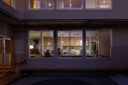 季節に応じた光の入射角をふまえた庇は、立面を分割し建具が過大になるのを避けている。中庭に対して徐々に庇がおりていってすり鉢状となることで、街区の奥の中庭でも大きな空を感じることができる。