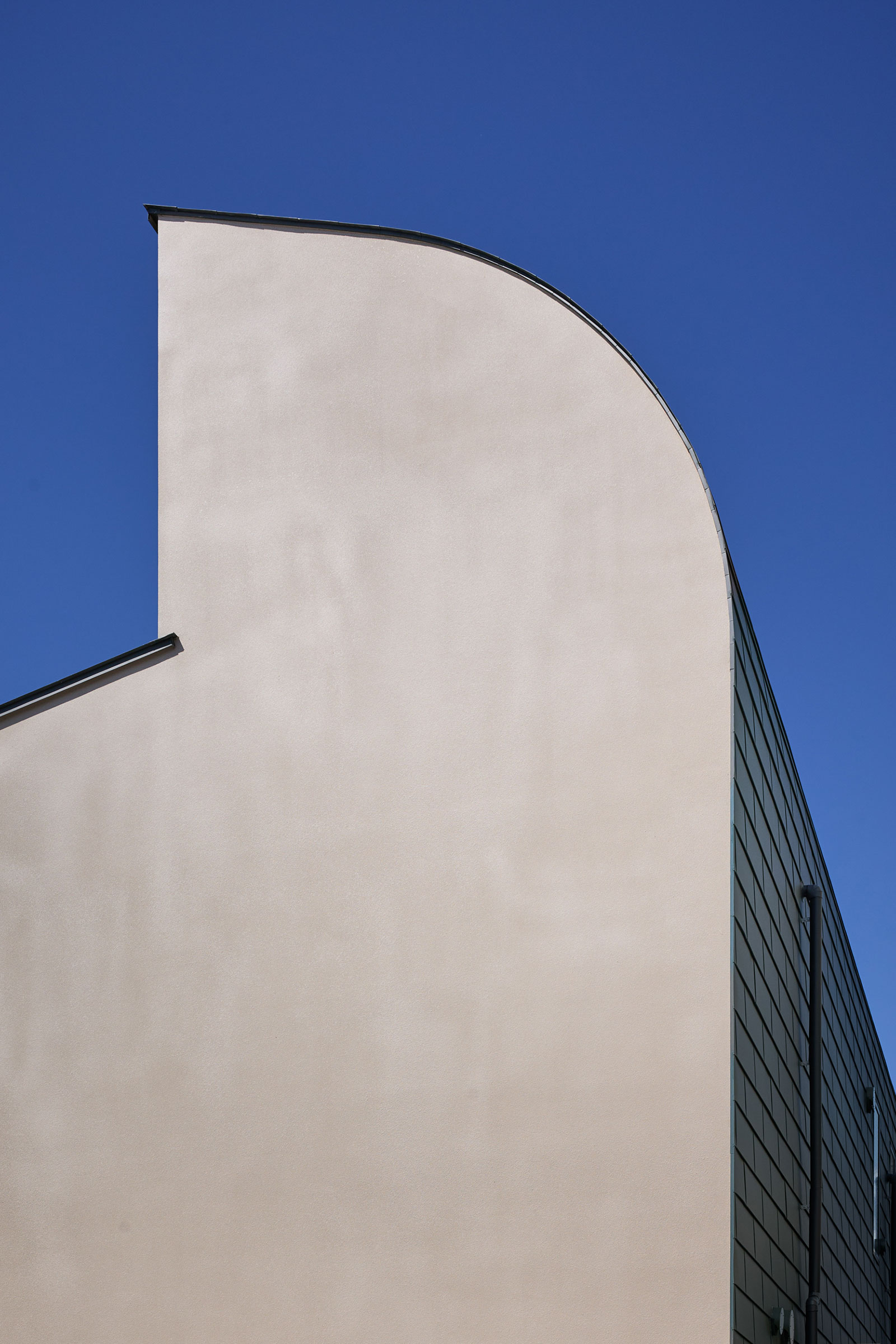 季節に応じた光の入射角をふまえた庇は、立面を分割し建具が過大になるのを避けている。中庭に対して徐々に庇がおりていってすり鉢状となることで、街区の奥の中庭でも大きな空を感じることができる。