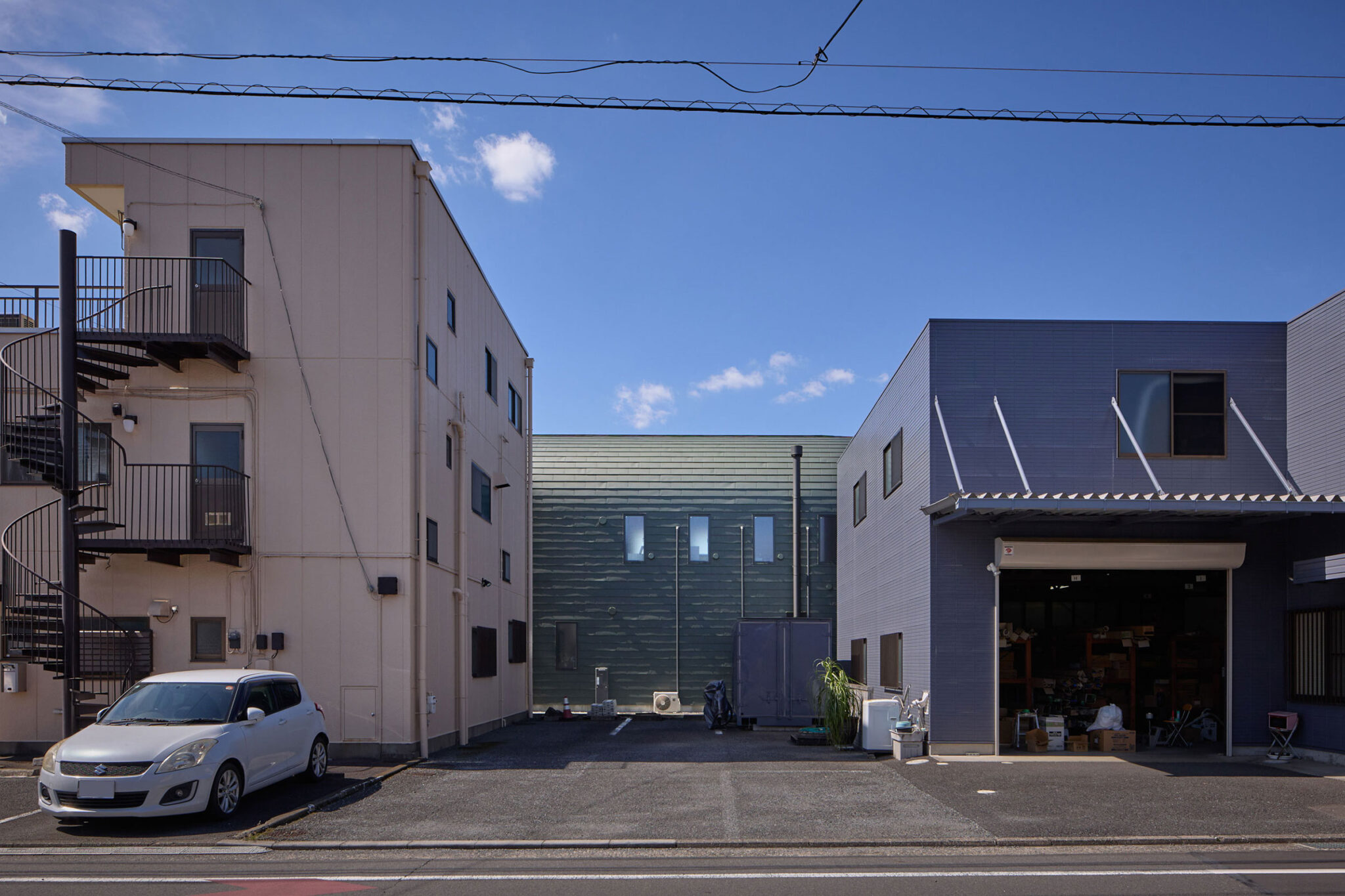 宮崎晃吉 / HAGISOによる、群馬の住宅「前橋の道の輪郭」。路地状の共有地などが見られる街区での計画。建築の時間と住み手の時間との折合いも主題とし、読み替えられながらも生き続ける存在を志向。路地の延長線上の“たまり”となる中庭の周りに諸室を配置する建築を考案外観、南側の道路より見る。 photo©楠瀬友将