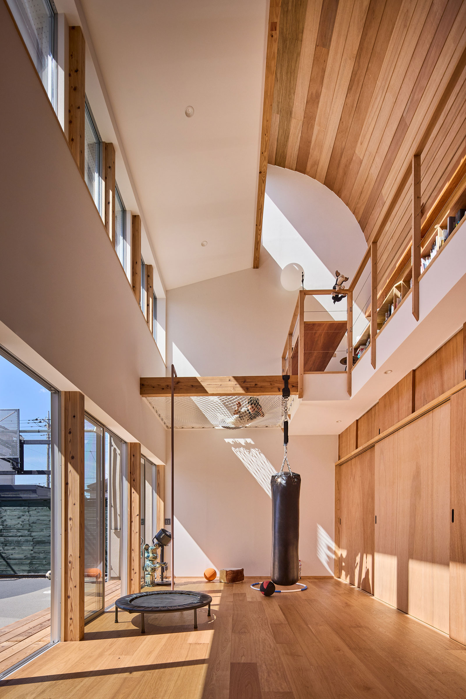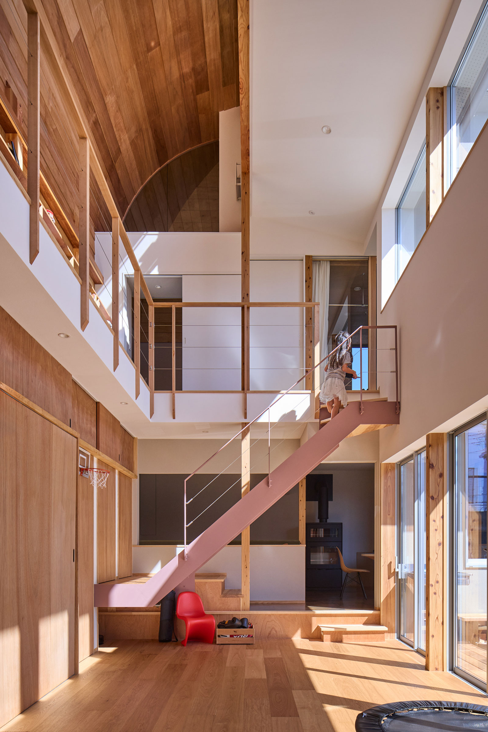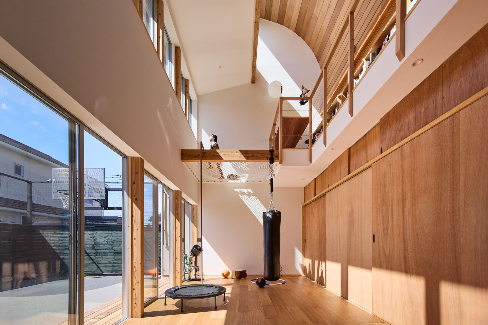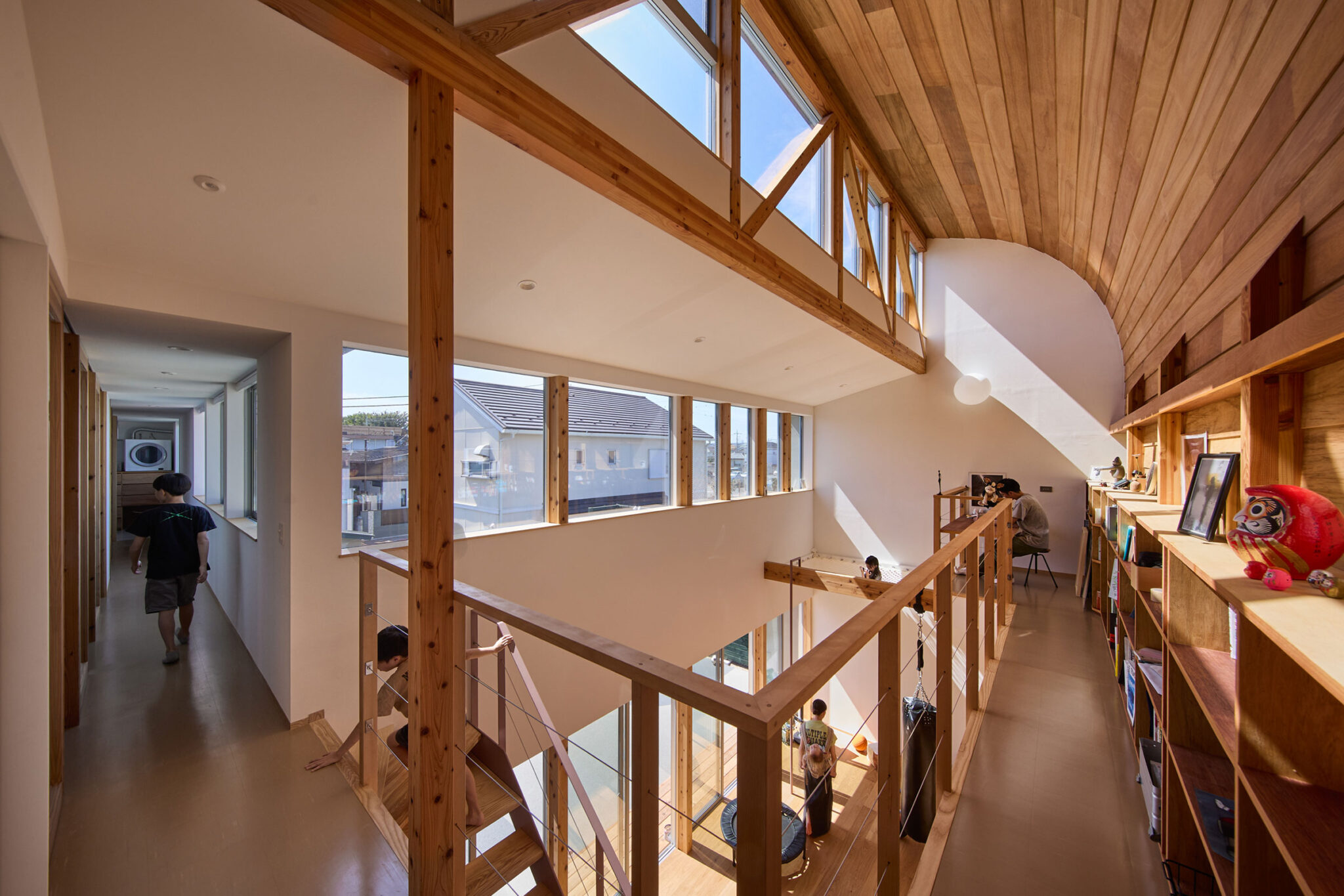 宮崎晃吉 / HAGISOによる、群馬の住宅「前橋の道の輪郭」。路地状の共有地などが見られる街区での計画。建築の時間と住み手の時間との折合いも主題とし、読み替えられながらも生き続ける存在を志向。路地の延長線上の“たまり”となる中庭の周りに諸室を配置する建築を考案2階、廊下から「アリーナ」の吹抜を見る。 photo©楠瀬友将