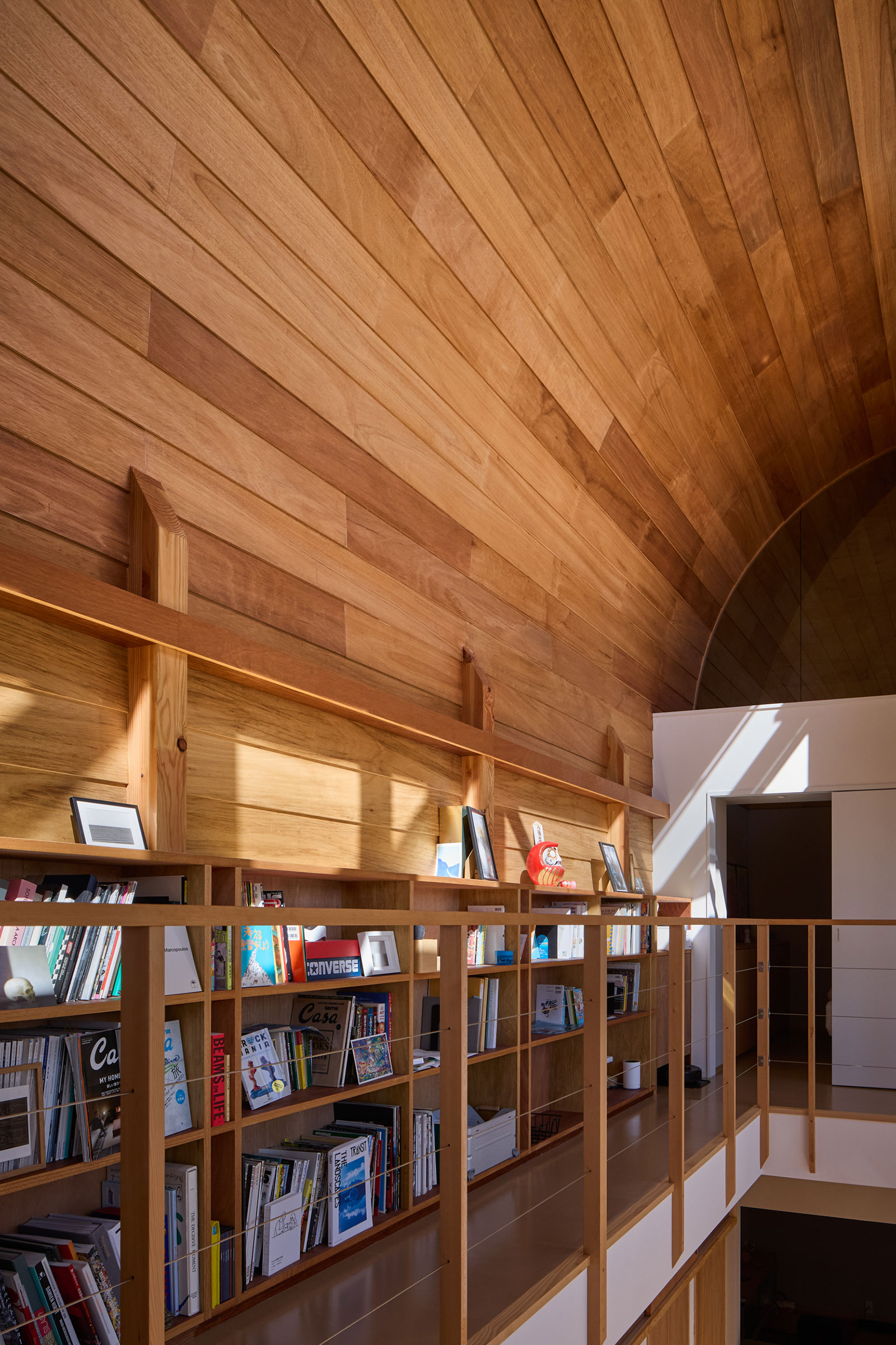 曲面壁の裏地としての内部仕上げはラワン合板の下見板張とし、書棚に並ぶ本や華奢な手すりとともに、無機質でシームレスな外観に対してスケールを落としている。