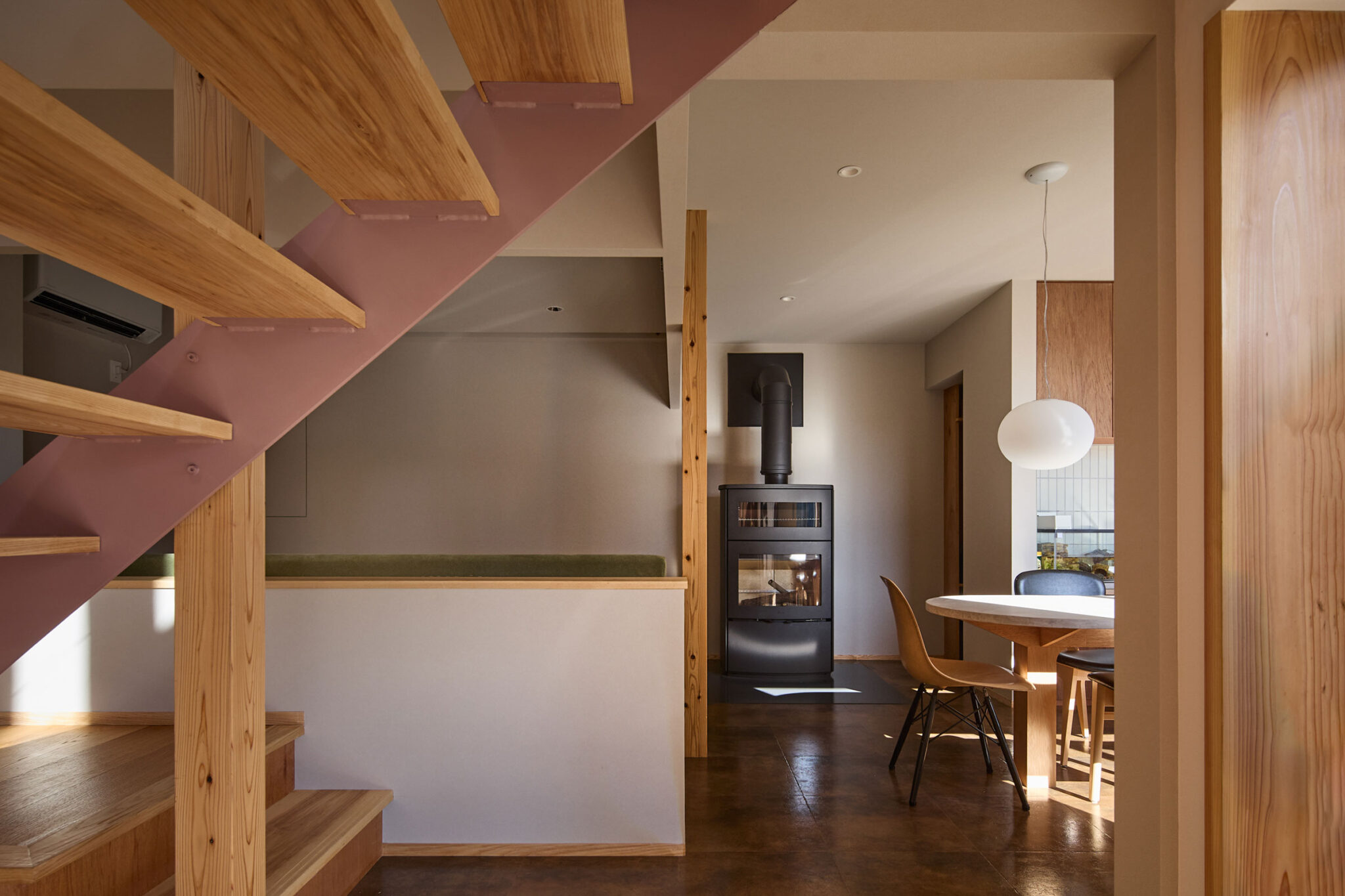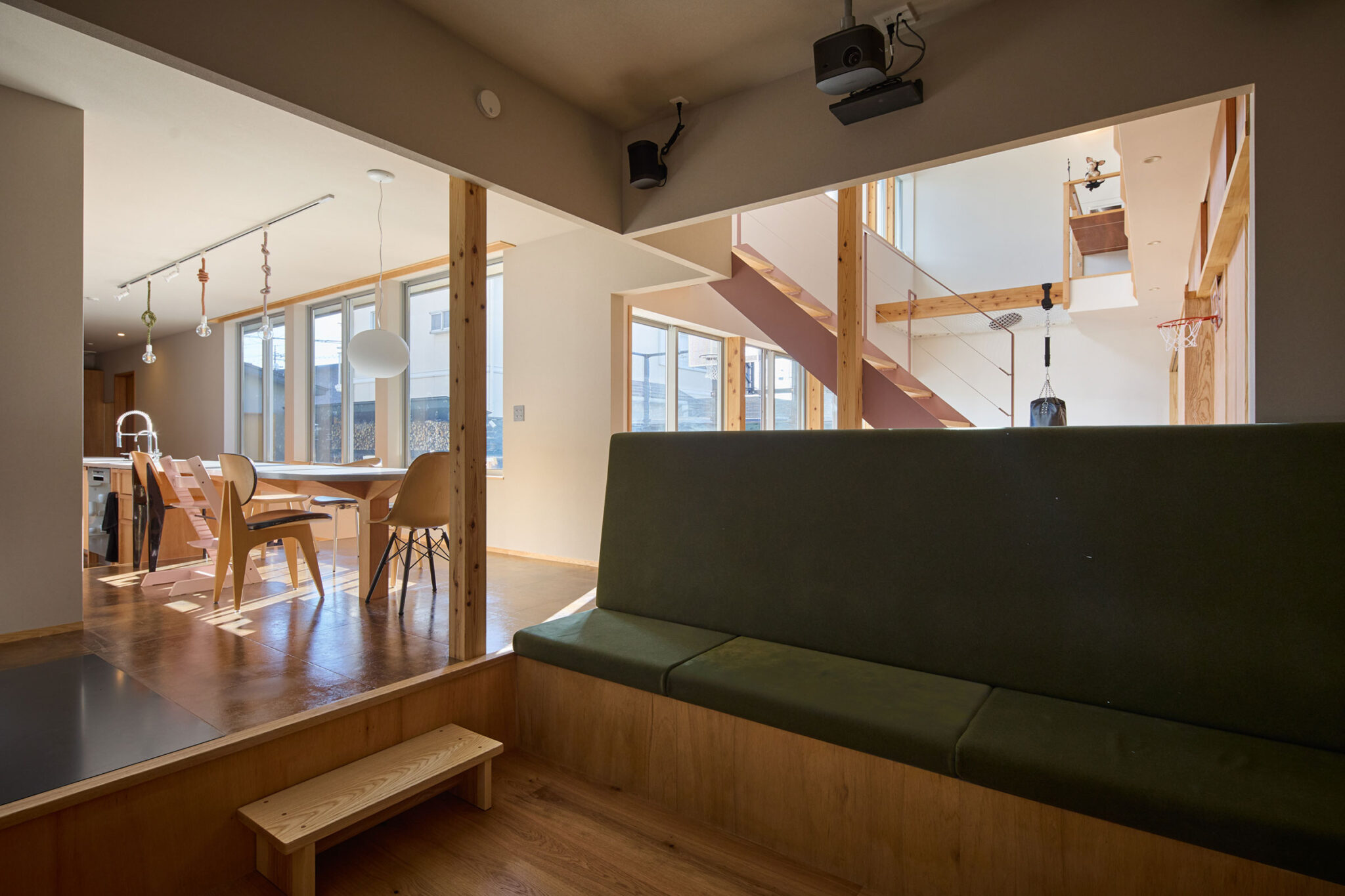 宮崎晃吉 / HAGISOによる、群馬の住宅「前橋の道の輪郭」。路地状の共有地などが見られる街区での計画。建築の時間と住み手の時間との折合いも主題とし、読み替えられながらも生き続ける存在を志向。路地の延長線上の“たまり”となる中庭の周りに諸室を配置する建築を考案1階、「アリーナ」から2階への階段を見る。 photo©楠瀬友将