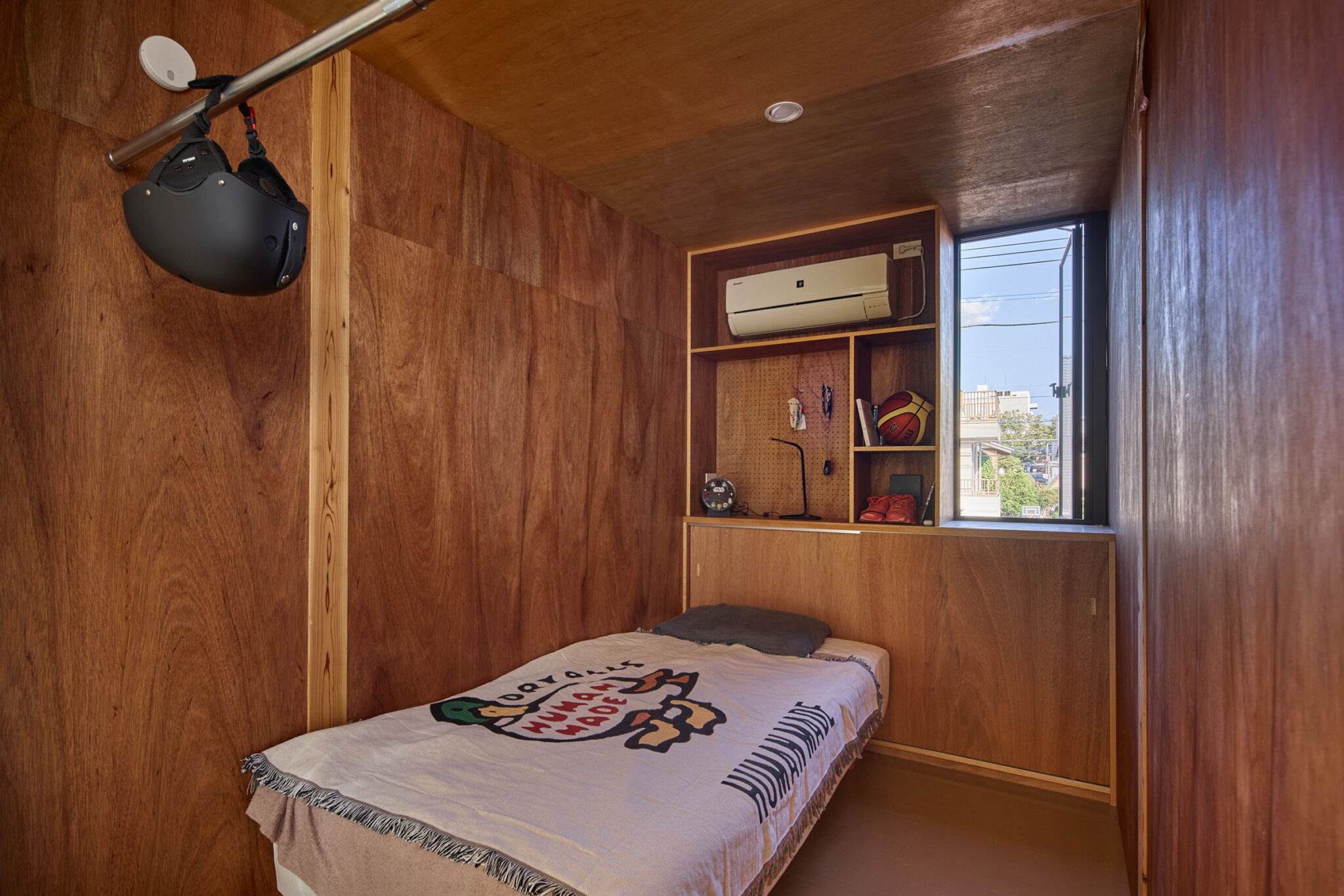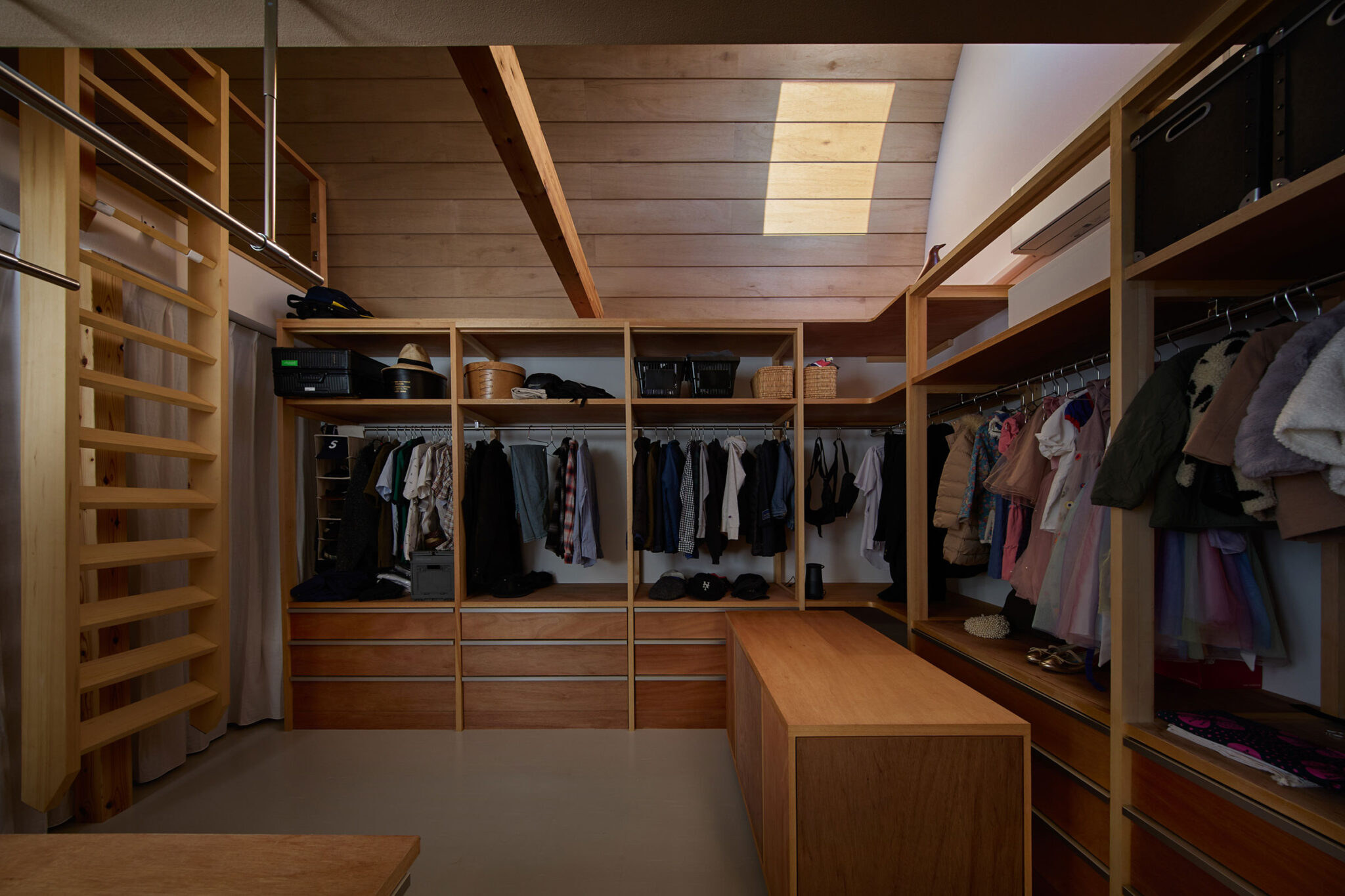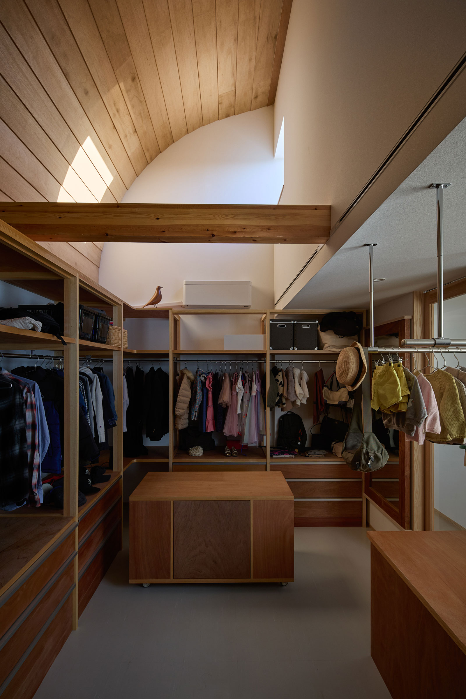 宮崎晃吉 / HAGISOによる、群馬の住宅「前橋の道の輪郭」。路地状の共有地などが見られる街区での計画。建築の時間と住み手の時間との折合いも主題とし、読み替えられながらも生き続ける存在を志向。路地の延長線上の“たまり”となる中庭の周りに諸室を配置する建築を考案2階、ウォークインクローゼット photo©楠瀬友将