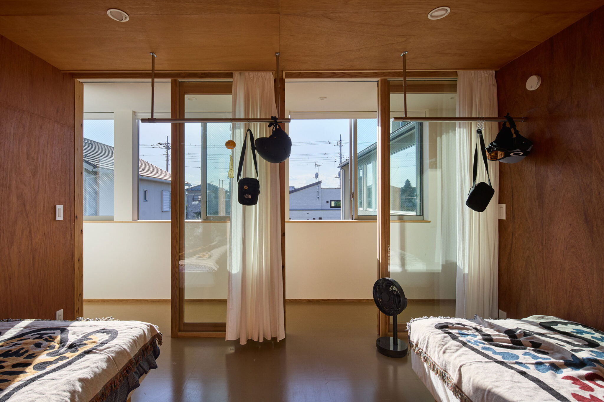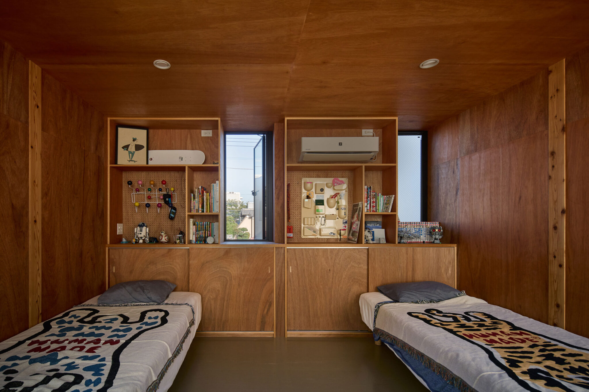 宮崎晃吉 / HAGISOによる、群馬の住宅「前橋の道の輪郭」。路地状の共有地などが見られる街区での計画。建築の時間と住み手の時間との折合いも主題とし、読み替えられながらも生き続ける存在を志向。路地の延長線上の“たまり”となる中庭の周りに諸室を配置する建築を考案2階、室1 photo©楠瀬友将