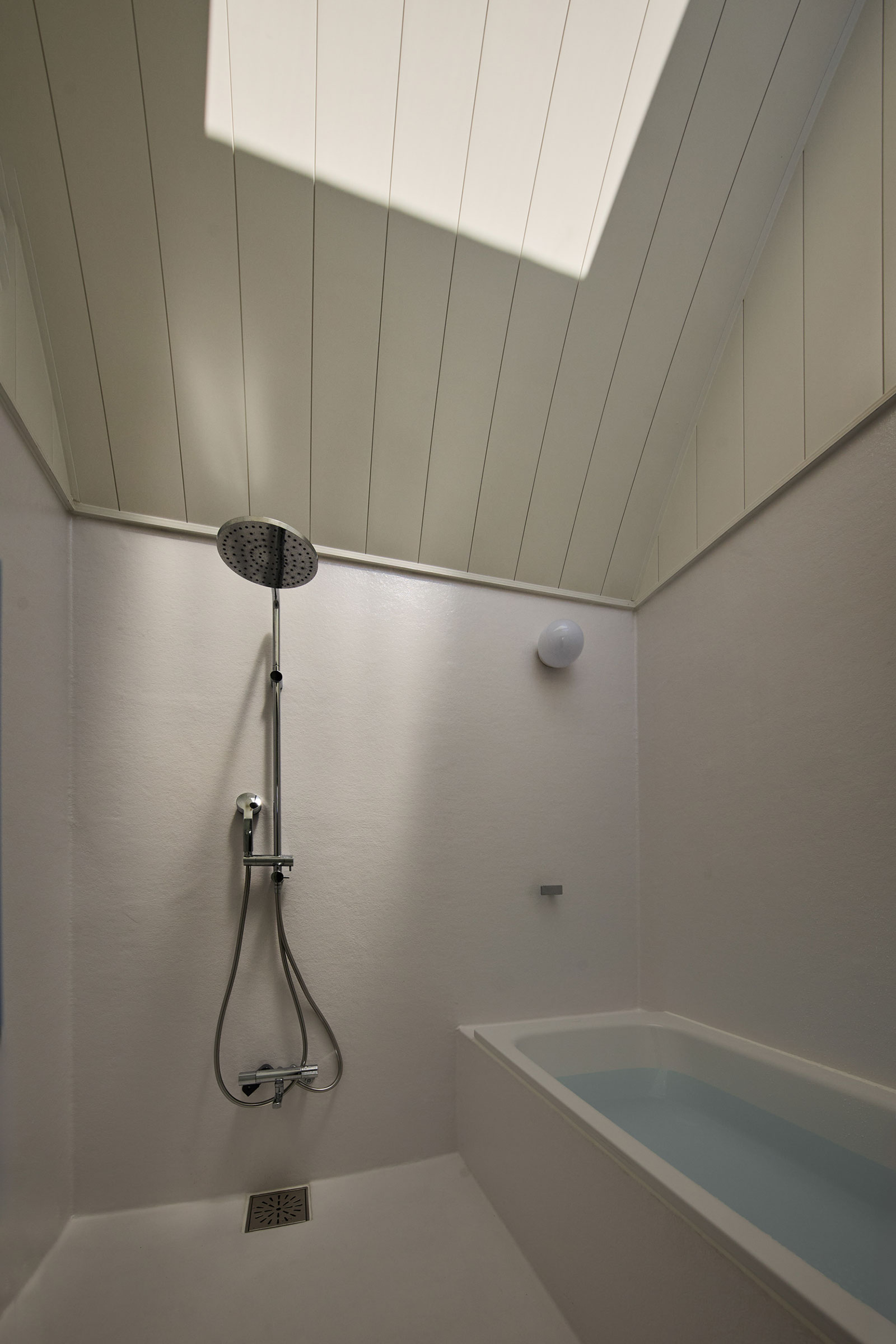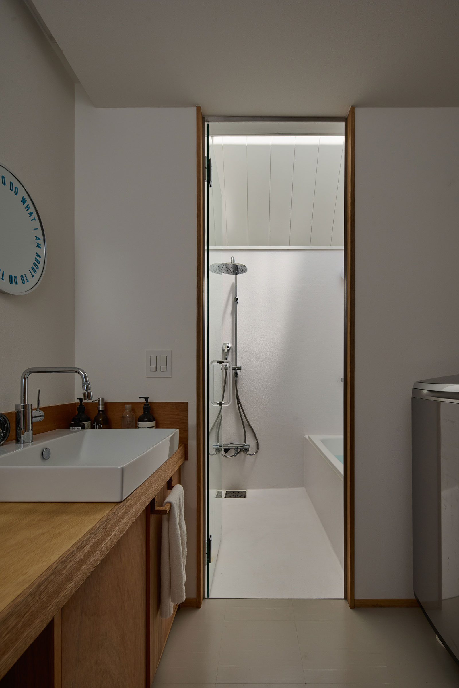 宮崎晃吉 / HAGISOによる、群馬の住宅「前橋の道の輪郭」。路地状の共有地などが見られる街区での計画。建築の時間と住み手の時間との折合いも主題とし、読み替えられながらも生き続ける存在を志向。路地の延長線上の“たまり”となる中庭の周りに諸室を配置する建築を考案2階、浴室 photo©楠瀬友将