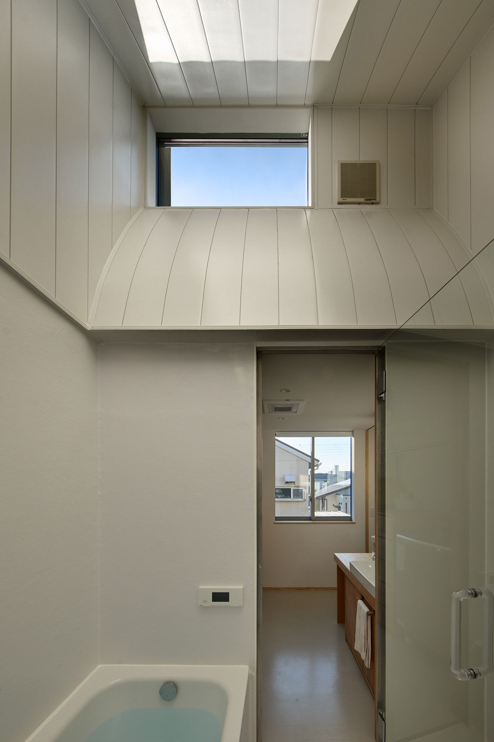 宮崎晃吉 / HAGISOによる、群馬の住宅「前橋の道の輪郭」。路地状の共有地などが見られる街区での計画。建築の時間と住み手の時間との折合いも主題とし、読み替えられながらも生き続ける存在を志向。路地の延長線上の“たまり”となる中庭の周りに諸室を配置する建築を考案2階、脱衣室から浴室を見る。 photo©楠瀬友将