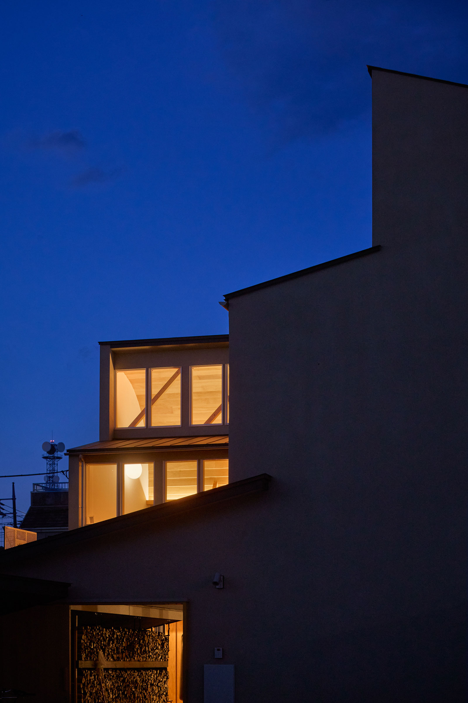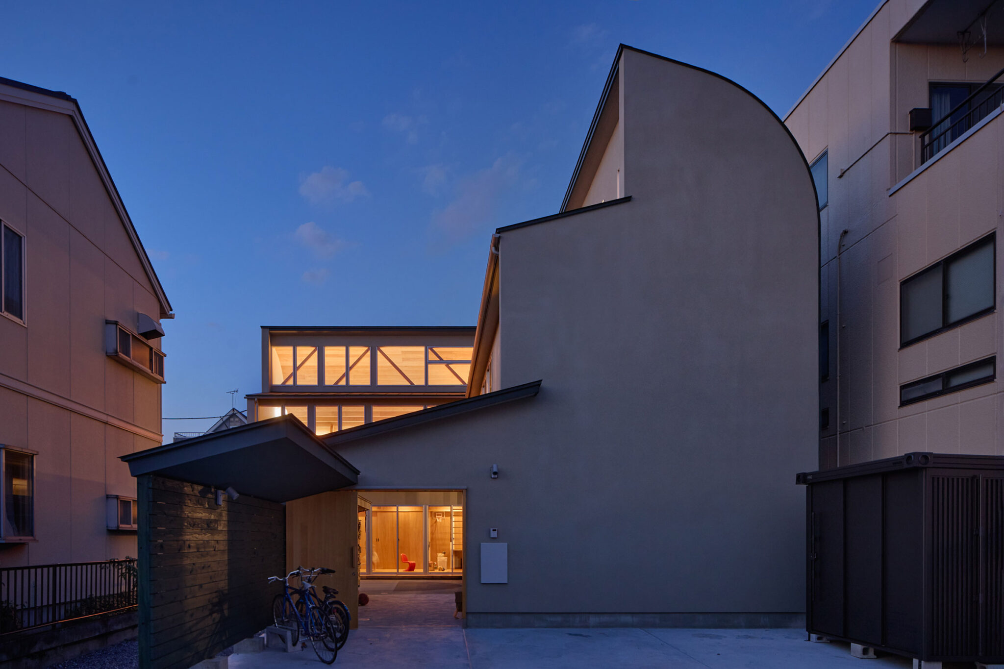 宮崎晃吉 / HAGISOによる、群馬の住宅「前橋の道の輪郭」。路地状の共有地などが見られる街区での計画。建築の時間と住み手の時間との折合いも主題とし、読み替えられながらも生き続ける存在を志向。路地の延長線上の“たまり”となる中庭の周りに諸室を配置する建築を考案外観、中庭から見る。夜景 photo©楠瀬友将