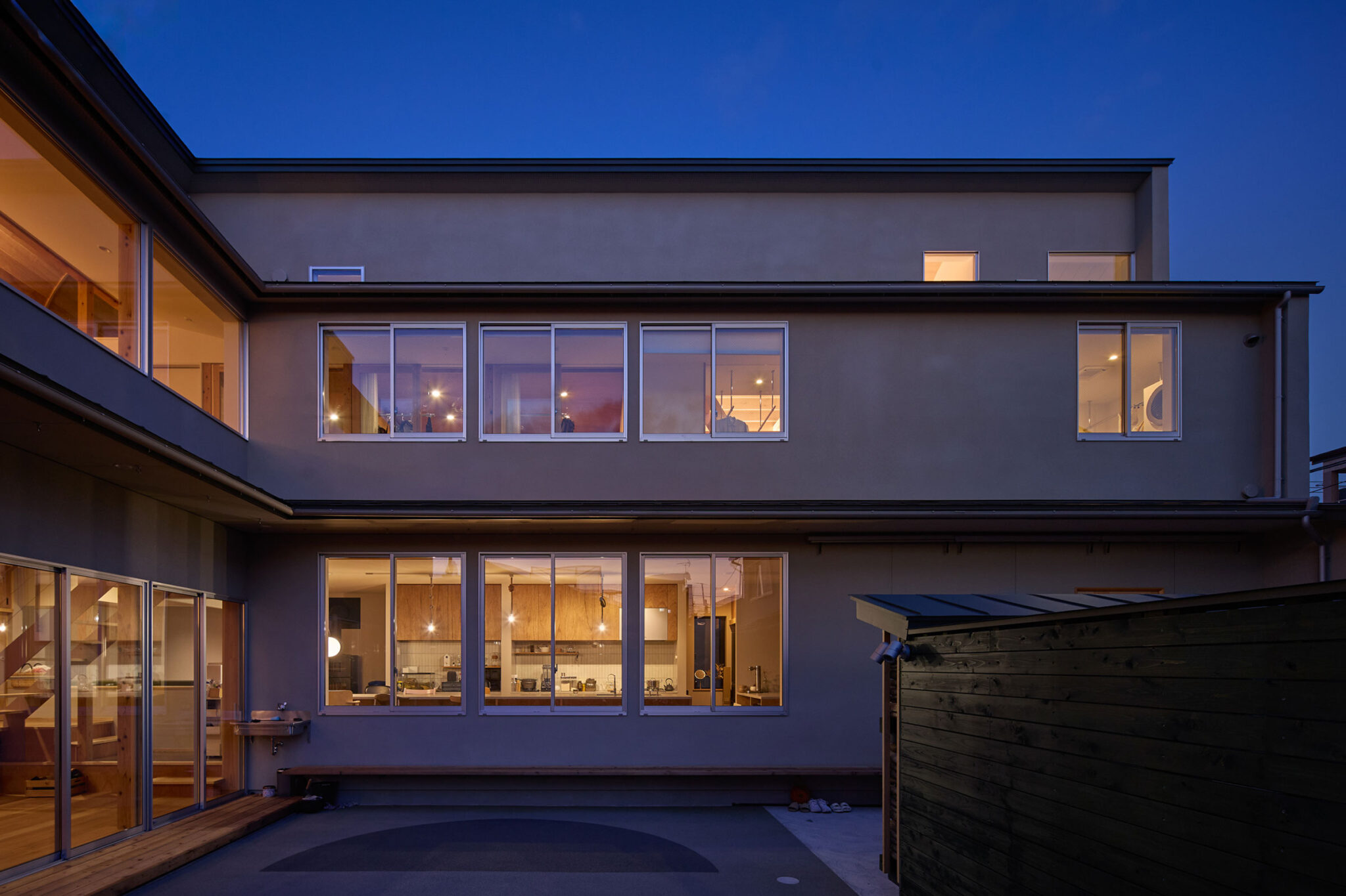 宮崎晃吉 / HAGISOによる、群馬の住宅「前橋の道の輪郭」。路地状の共有地などが見られる街区での計画。建築の時間と住み手の時間との折合いも主題とし、読み替えられながらも生き続ける存在を志向。路地の延長線上の“たまり”となる中庭の周りに諸室を配置する建築を考案外観、中庭から開口部越しにダイニングとキッチンを見る。夕景 photo©楠瀬友将