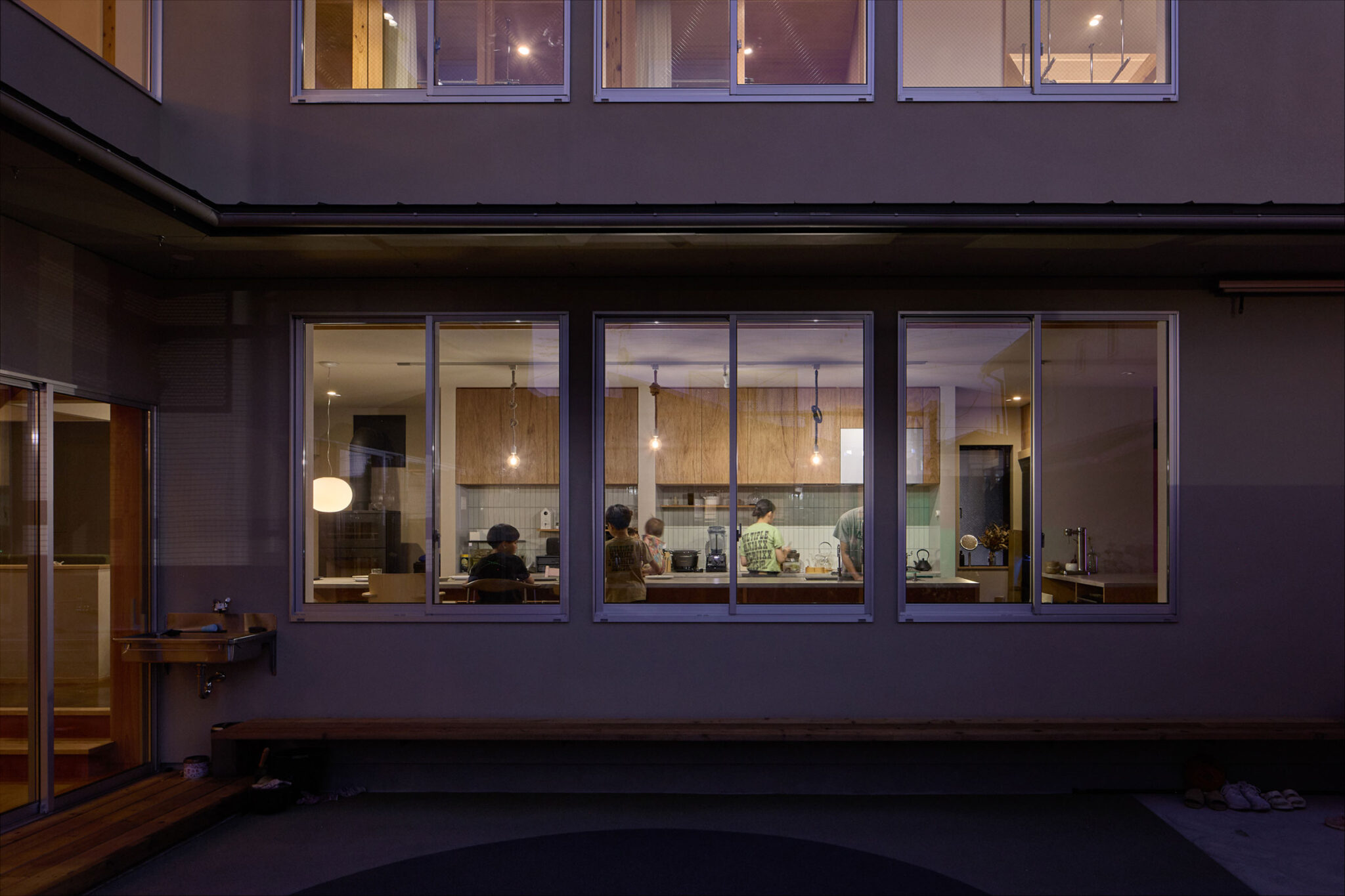 宮崎晃吉 / HAGISOによる、群馬の住宅「前橋の道の輪郭」。路地状の共有地などが見られる街区での計画。建築の時間と住み手の時間との折合いも主題とし、読み替えられながらも生き続ける存在を志向。路地の延長線上の“たまり”となる中庭の周りに諸室を配置する建築を考案「通り庭」より中庭を見る。夜景 photo©楠瀬友将